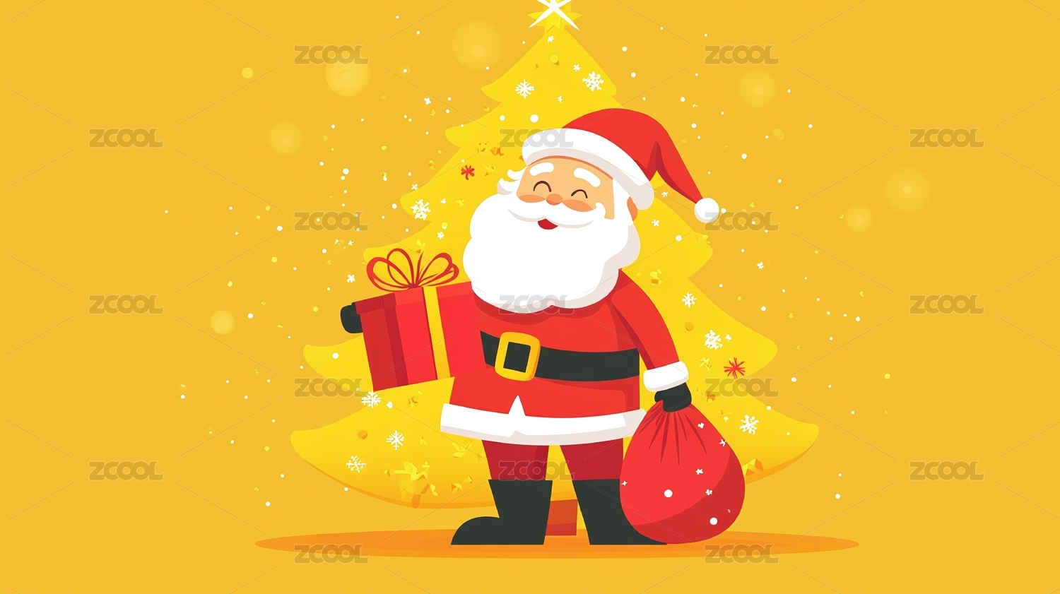 圣诞老人拿着礼物的金黄色背景卡通插图