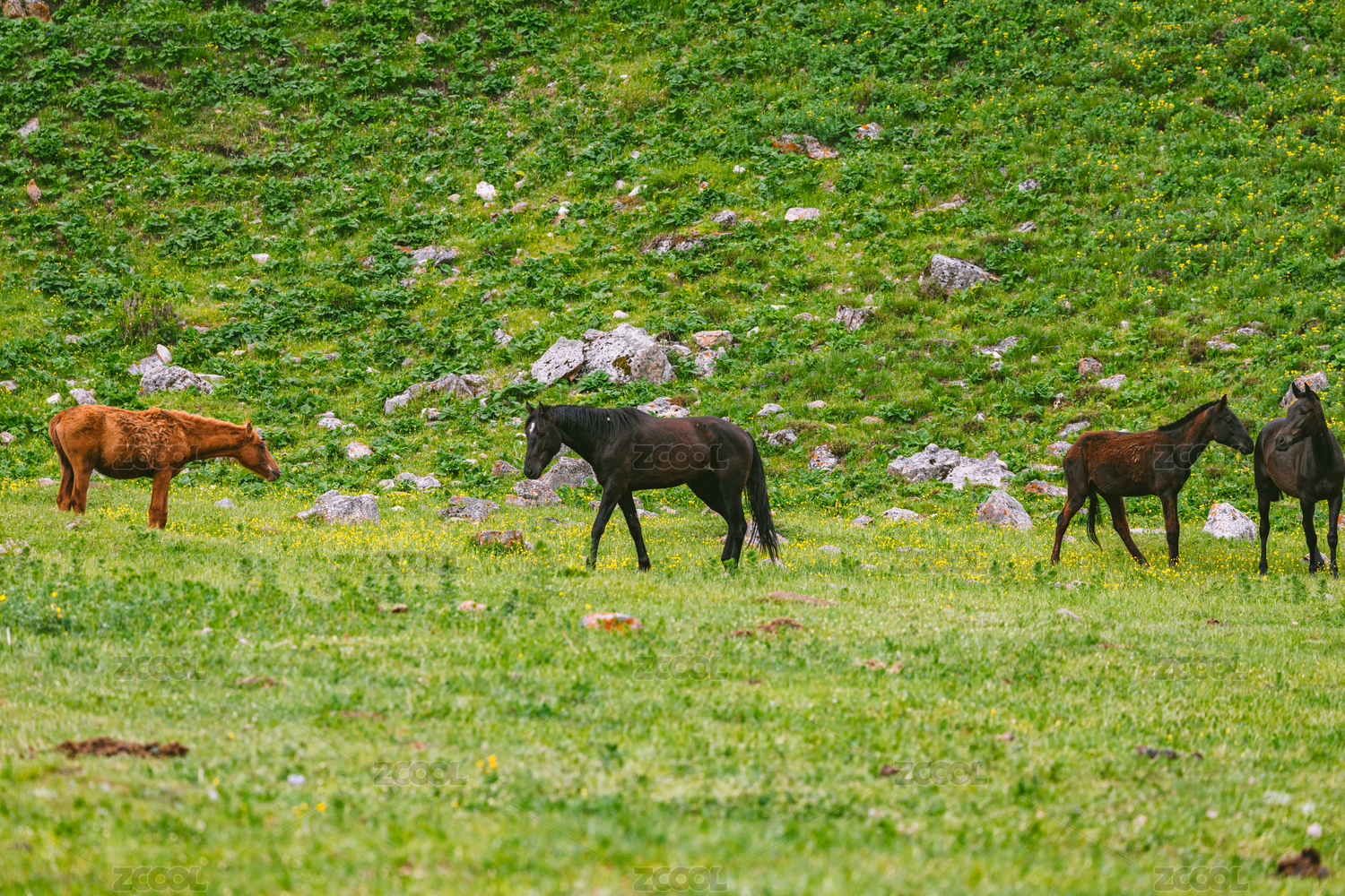 夏天中国新疆,绿色草原上几匹马正在吃草
