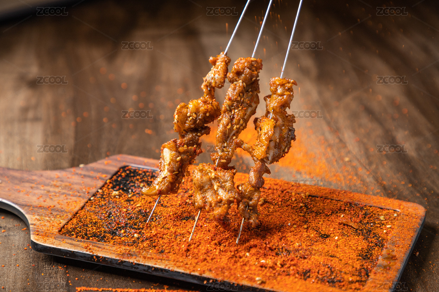 黑色烤架上放着几串撒着辣椒面的油炸肉筋