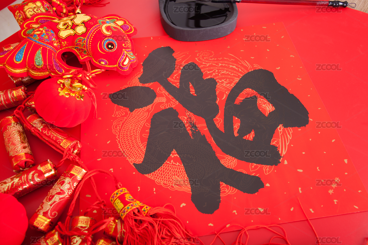 中国红色的福字春联和各种装饰品及砚台和毛笔