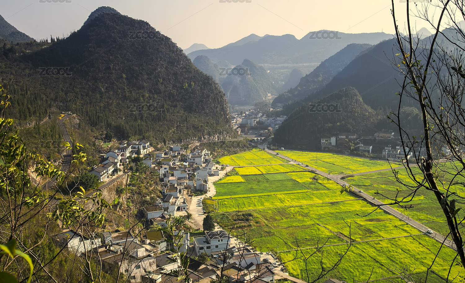中国云南的喀斯特地貌油菜花和村庄