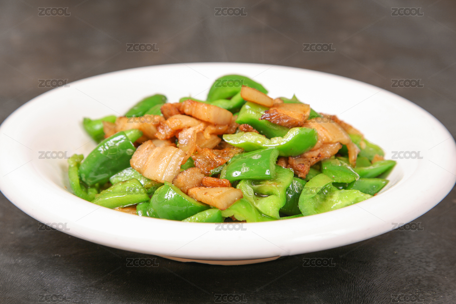 黑色背景一盘五花肉炒辣椒