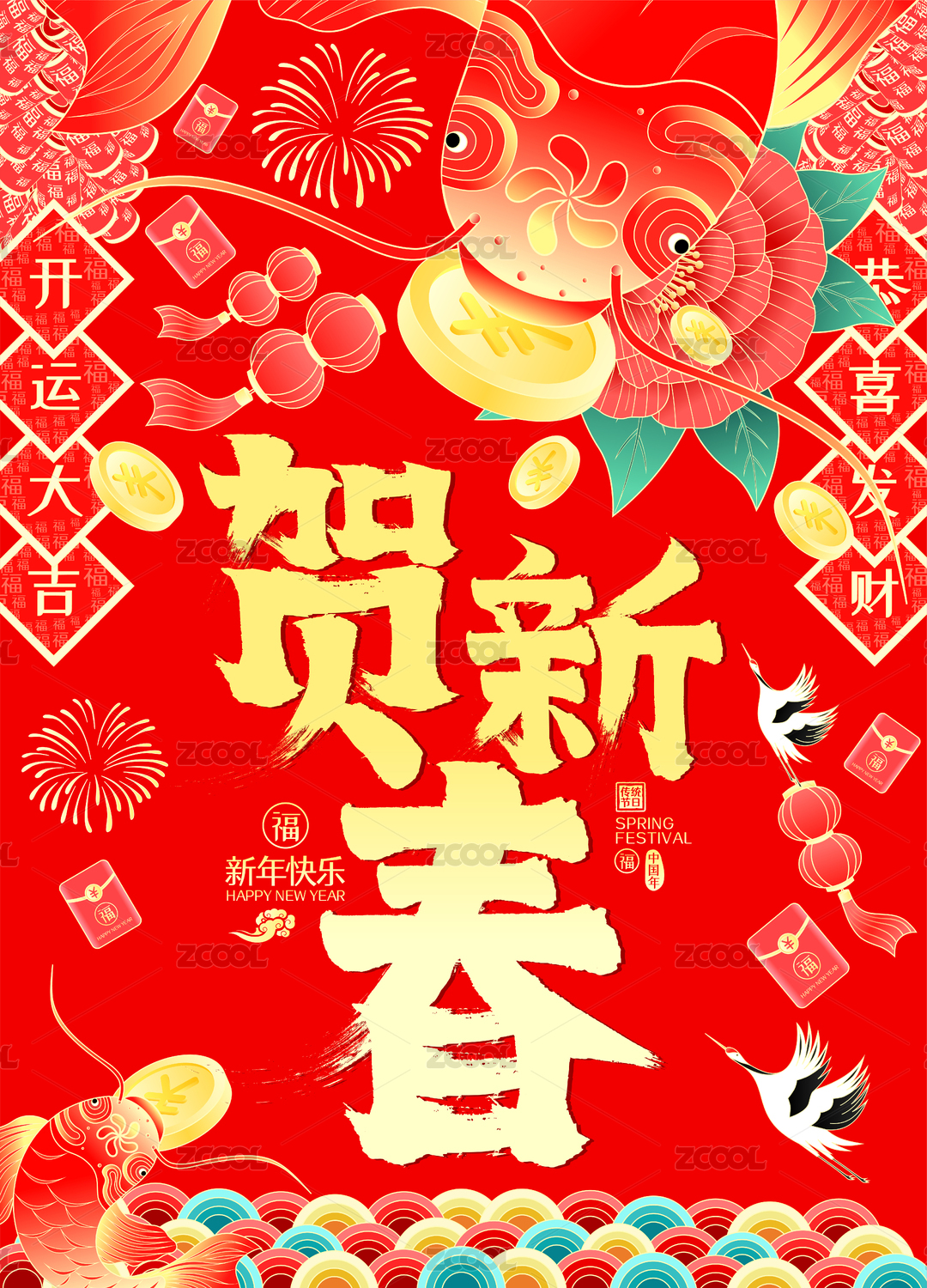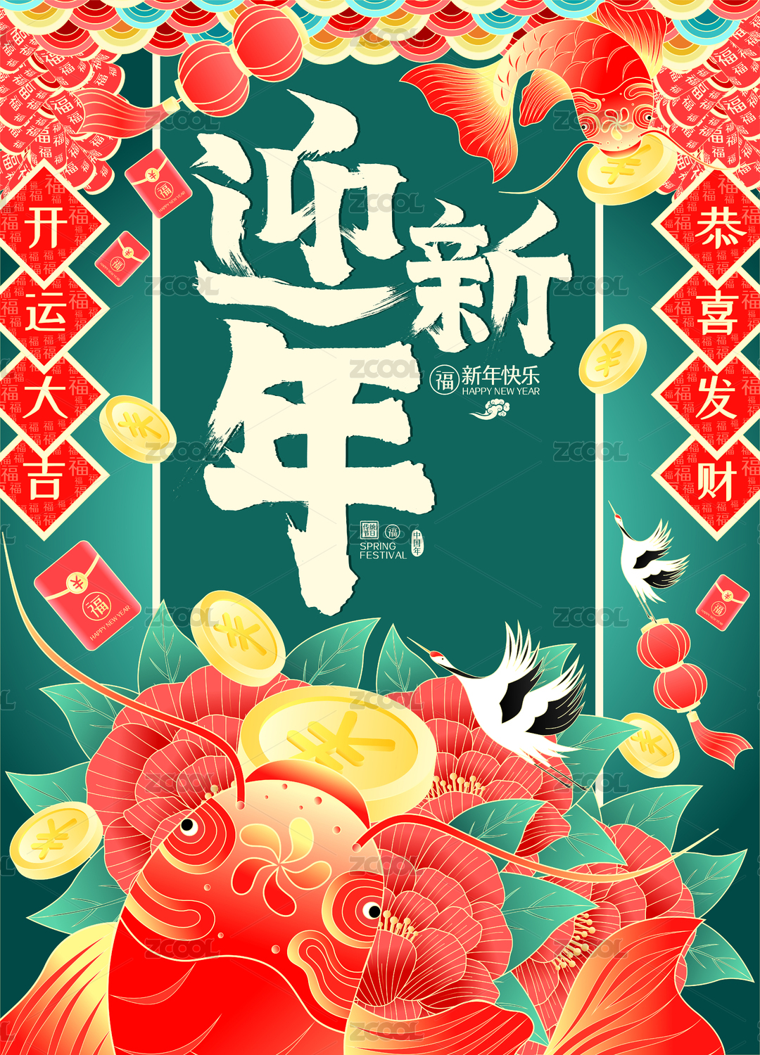 新年快乐锦鲤牡丹仙鹤送福开运春节海报