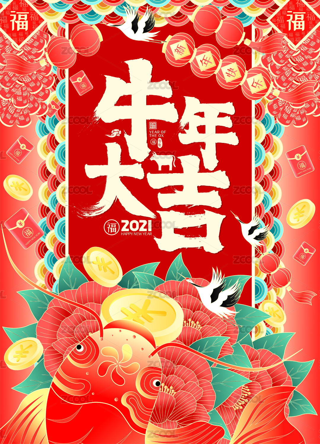 牛年大吉锦鲤牡丹仙鹤送福开运春节海报
