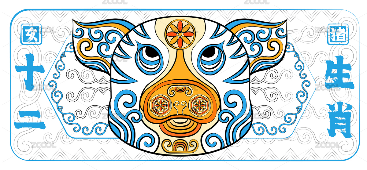 亥猪十二生肖潮流印花图案传统纹样矢量插画