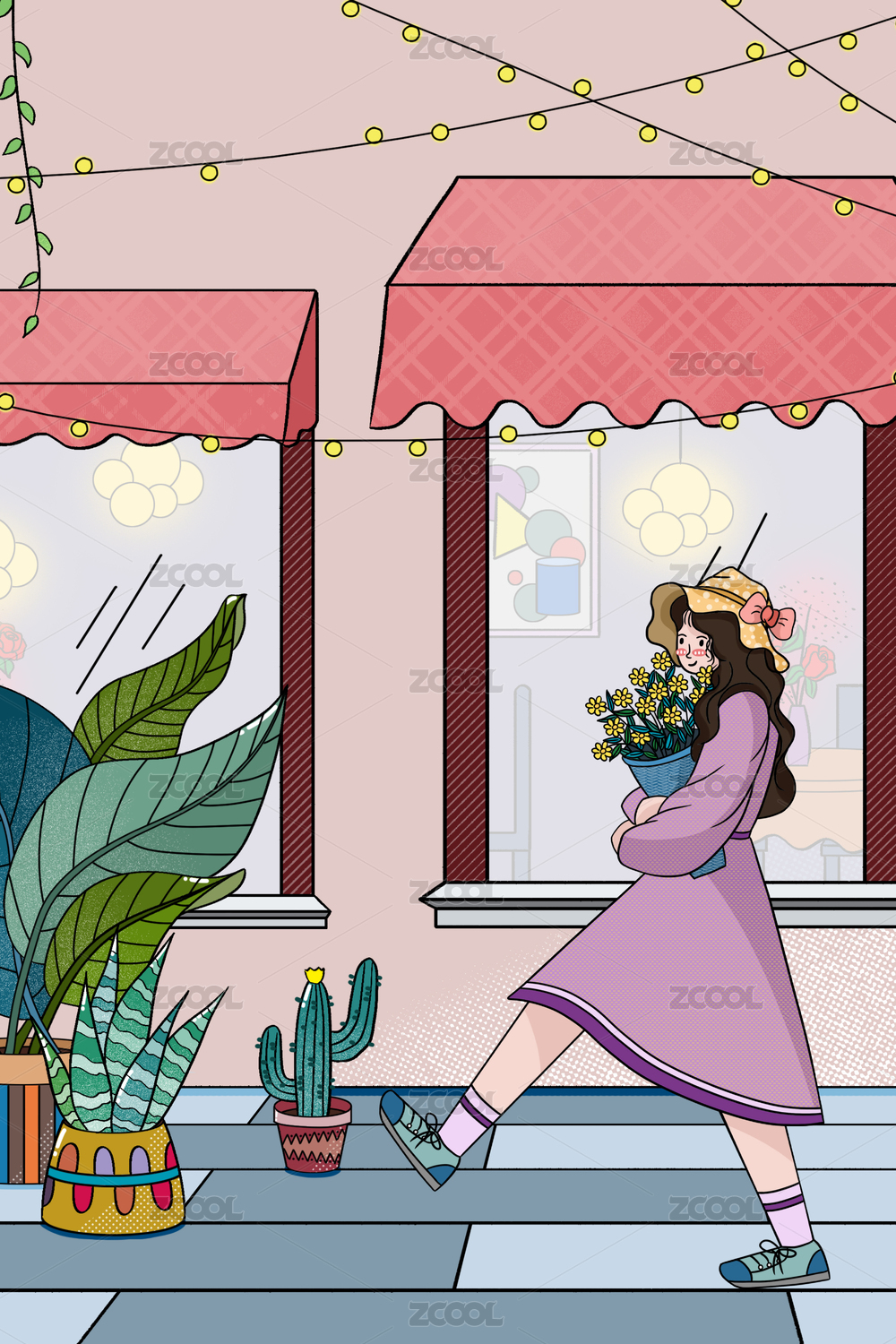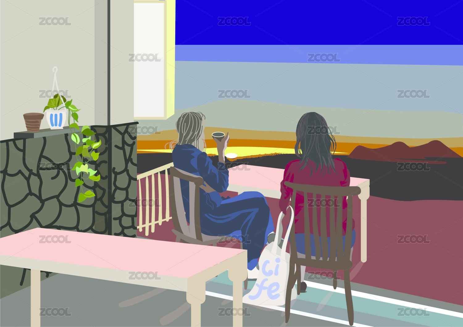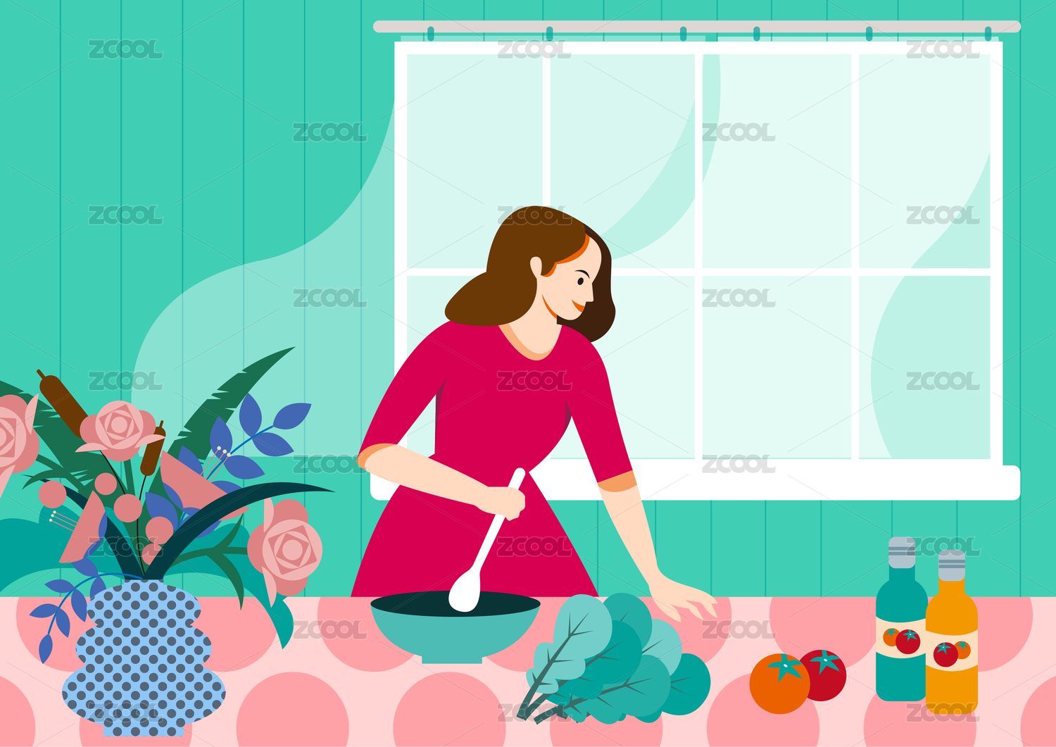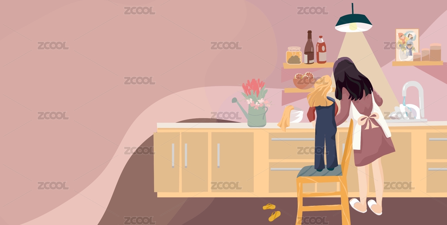 厨房洗碗的母女劳动节母亲节横版矢量插画