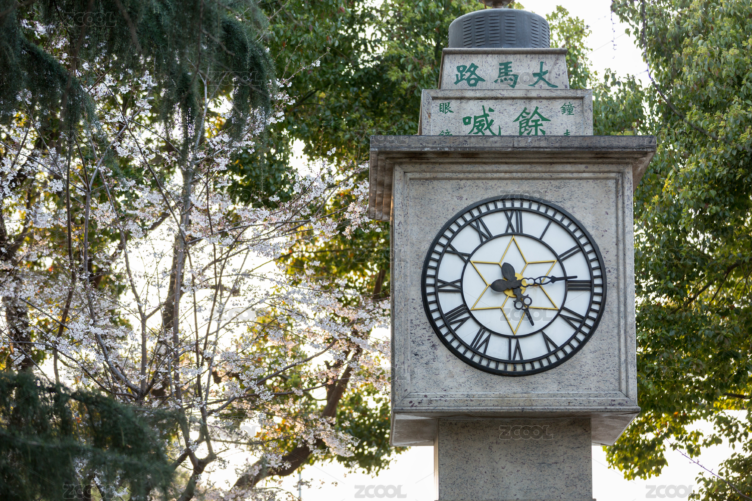 中国江苏省苏州石路樱花中的自鸣塔钟
