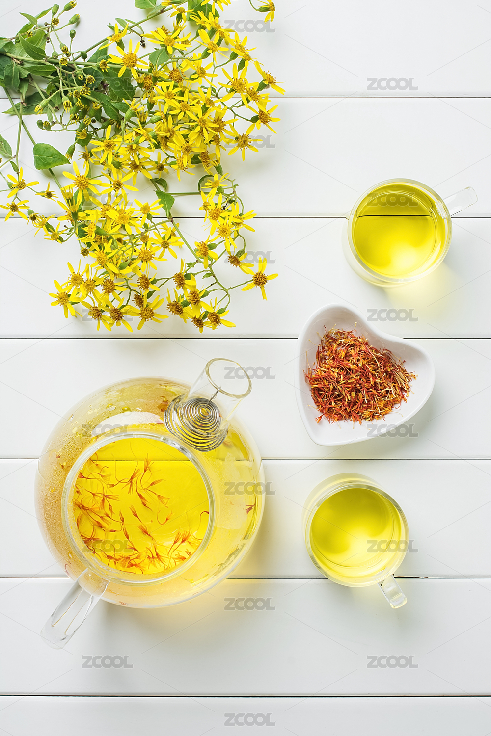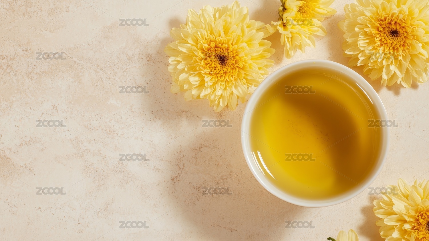 浅色台面菊花与茶饮