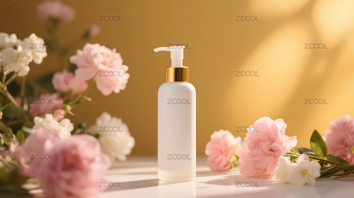 金色泵头白色瓶子与花朵