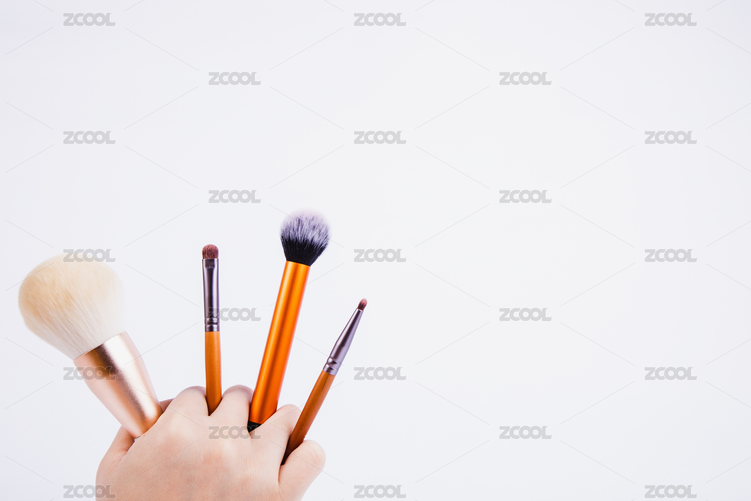 白色背景特写一支手抓着各种尺寸的化妆刷