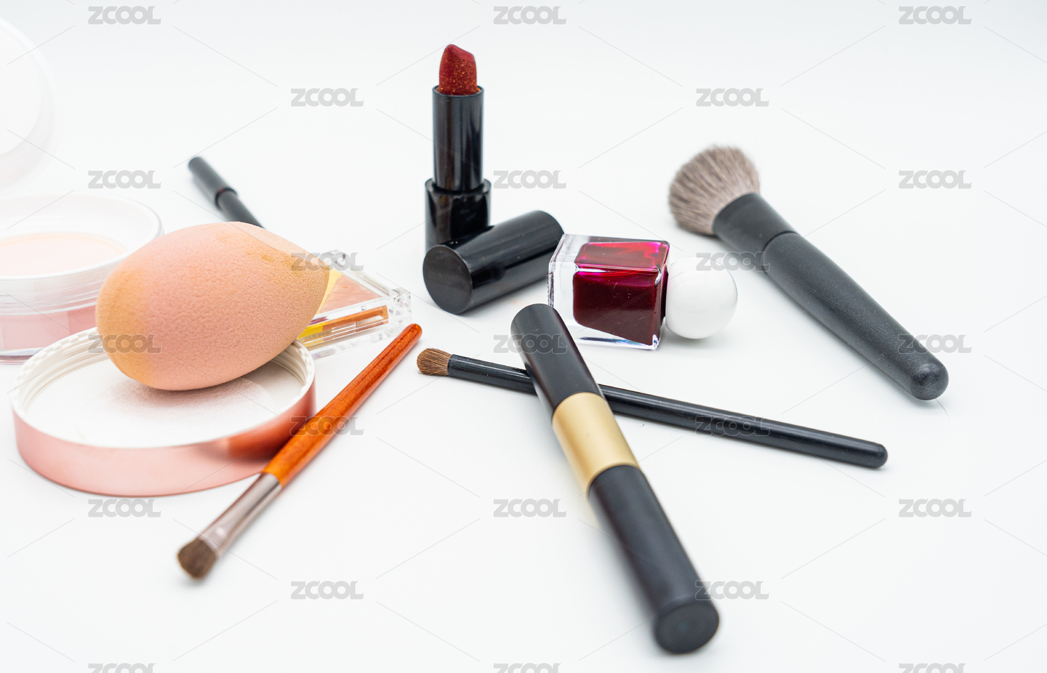 摆放在白色背景上的女性化妆用品