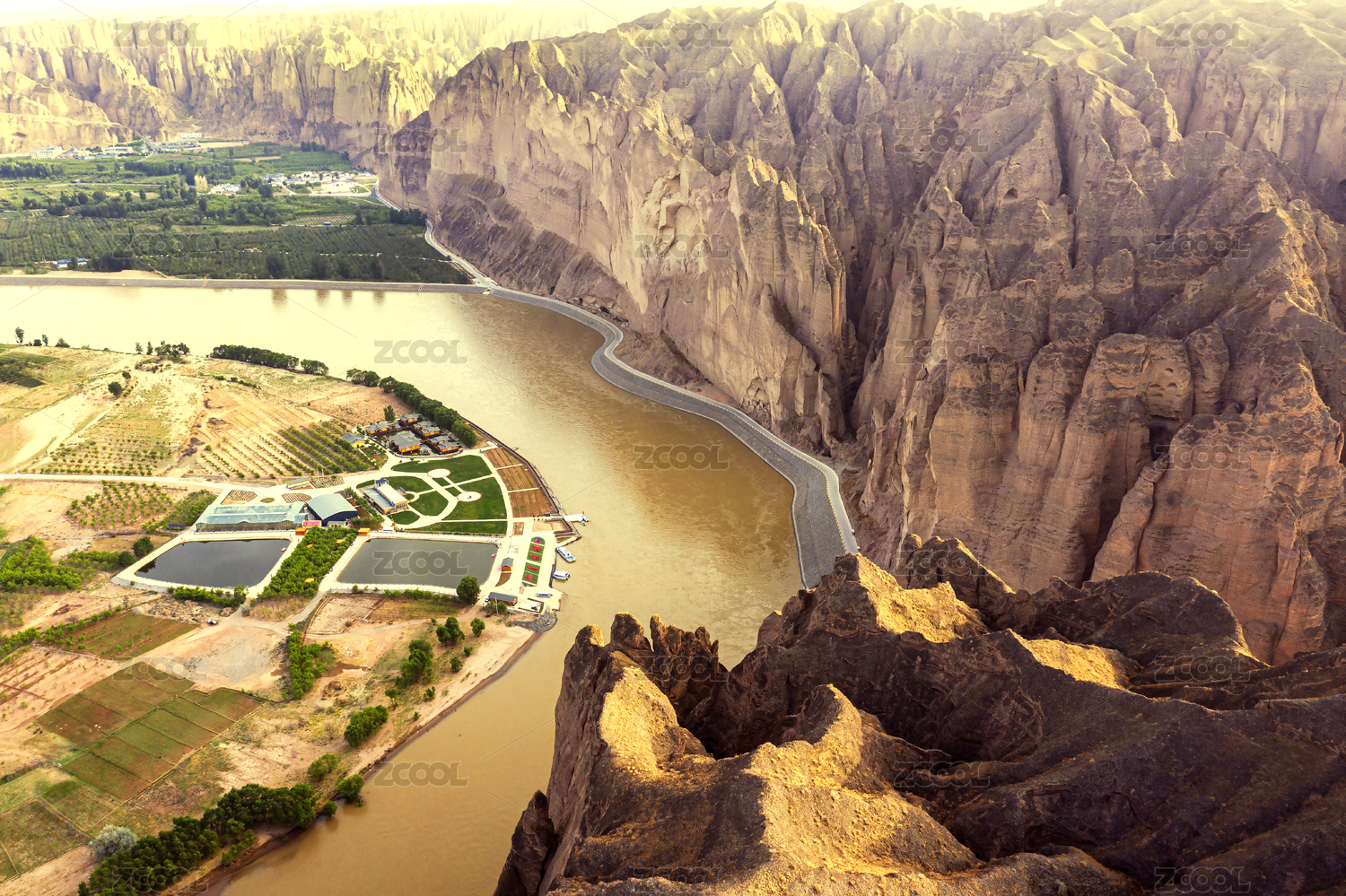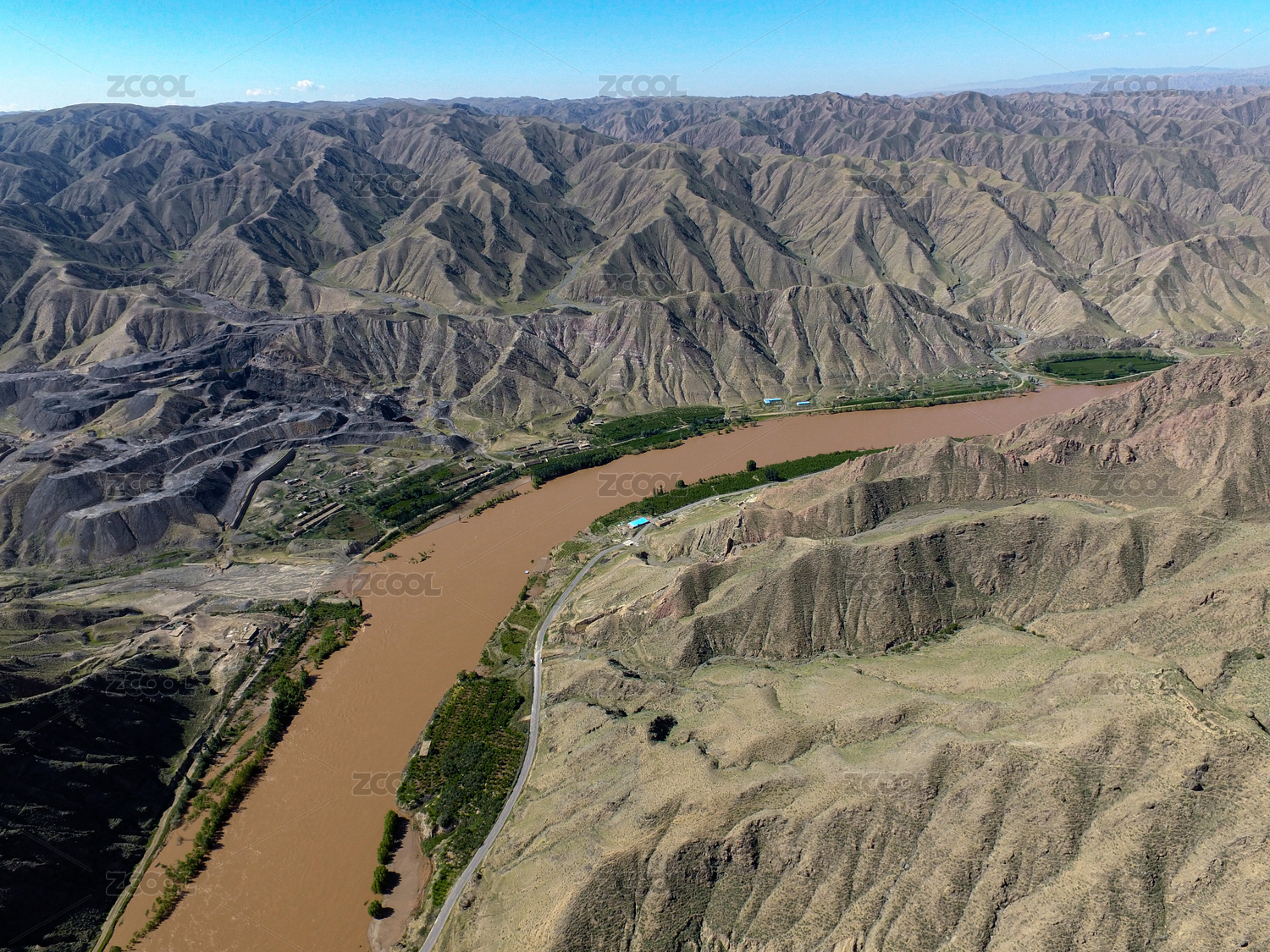 中国宁夏省中卫市66号公路黄河与山地航拍