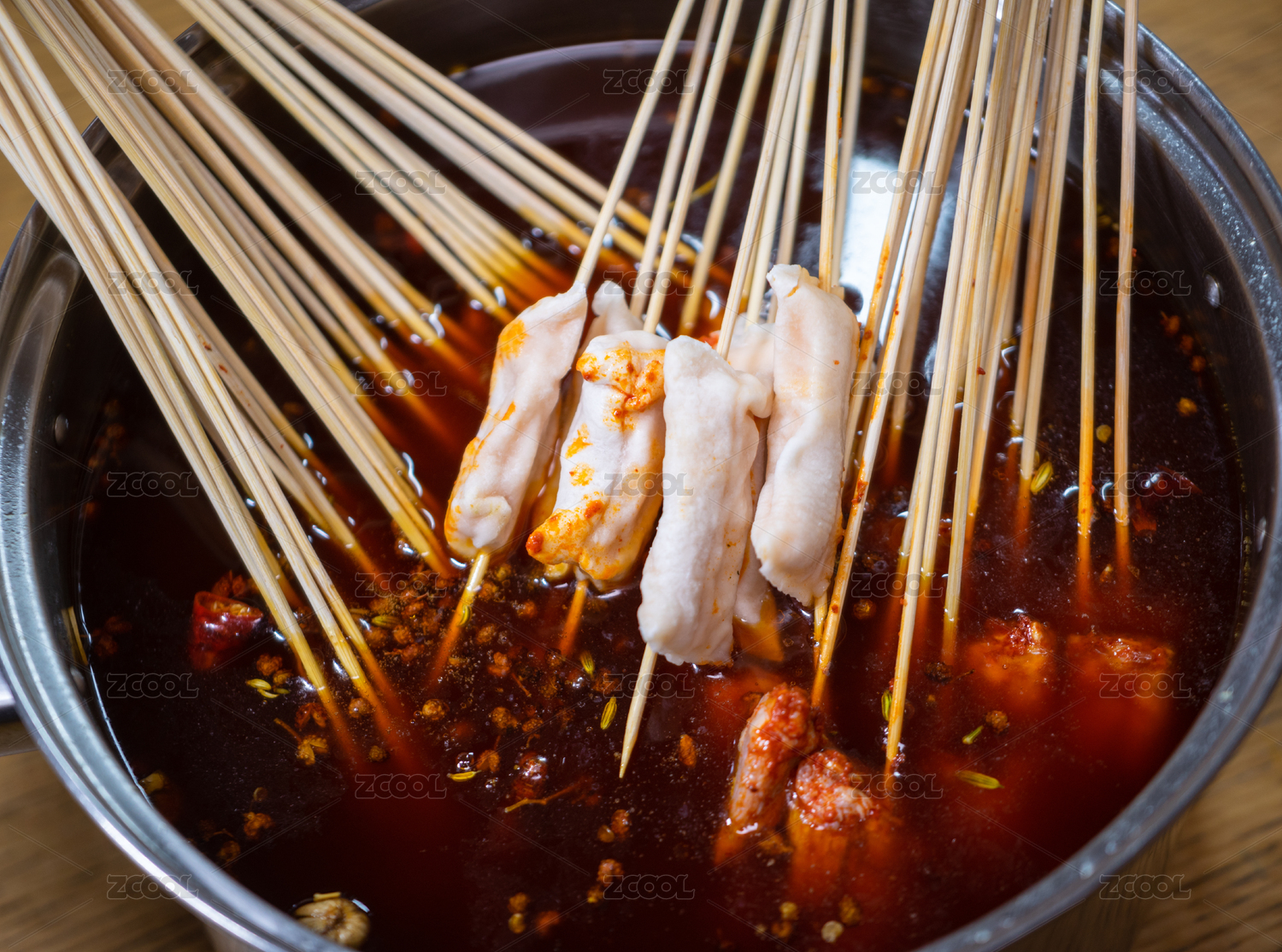 一个盆里面装有麻辣红油和火锅串串