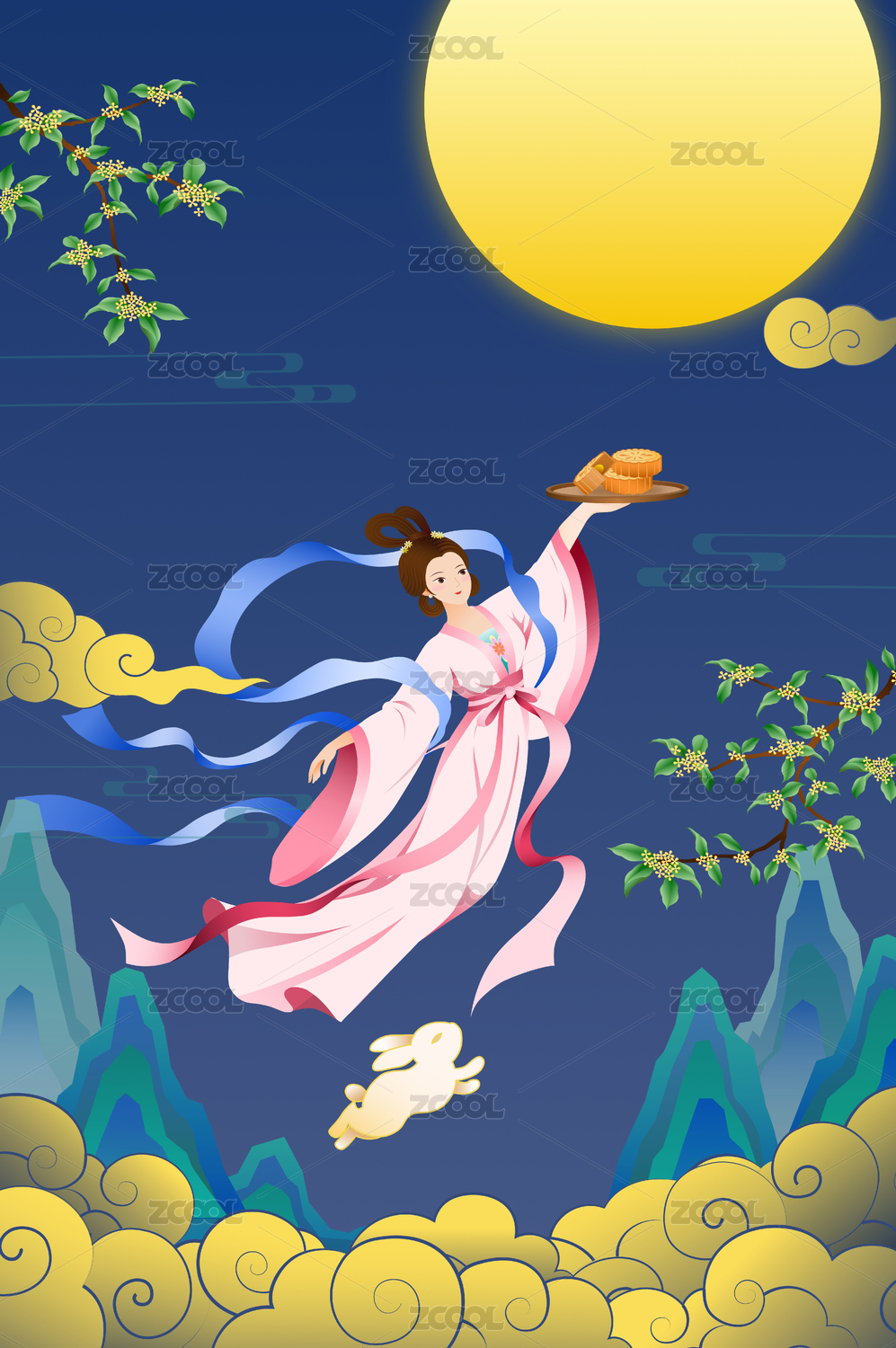 中秋节嫦娥和月亮玉兔桂花等竖版