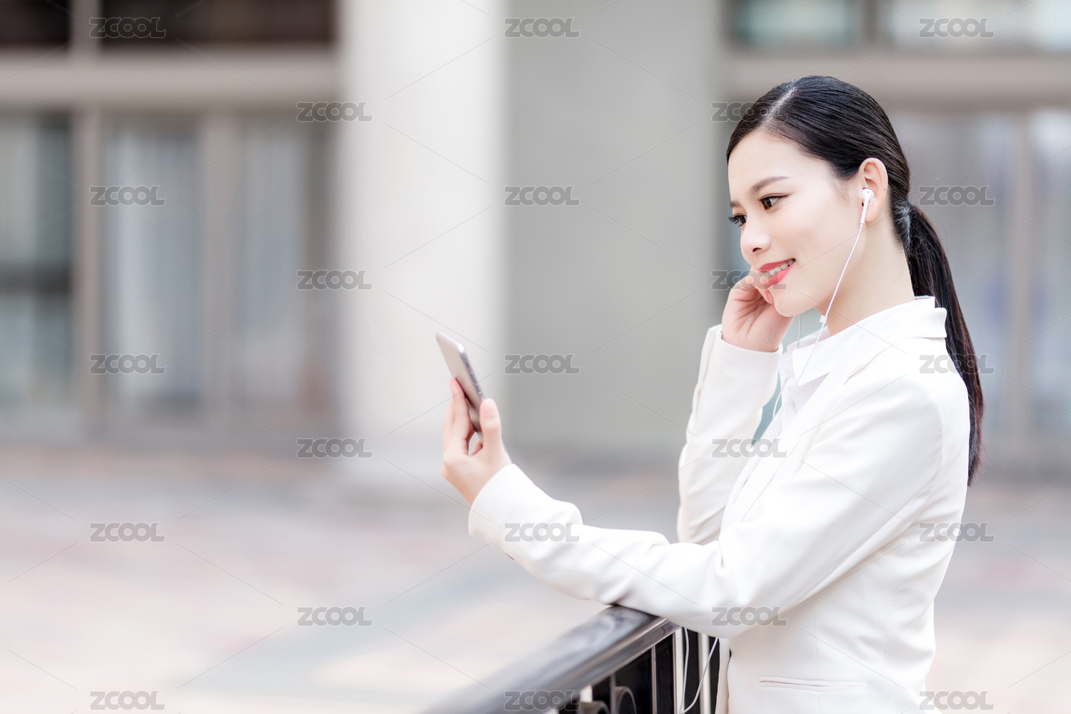 专业美丽的业务小姐拿着电话望着远处的街道上蓝色的天空阳光灿烂的日子在办公室外。