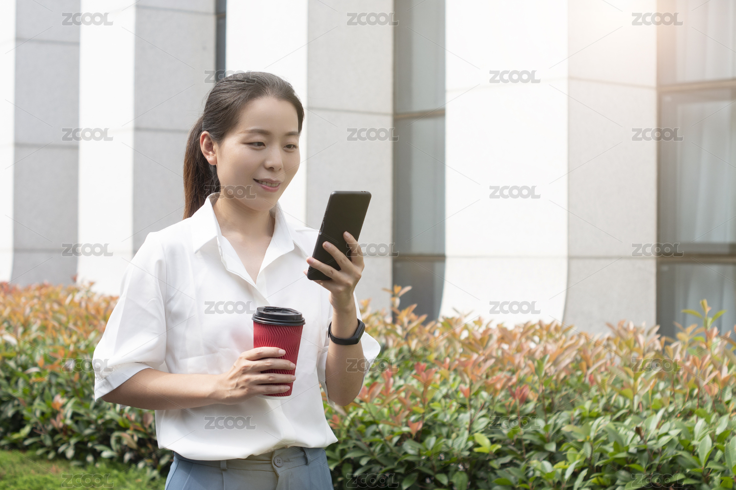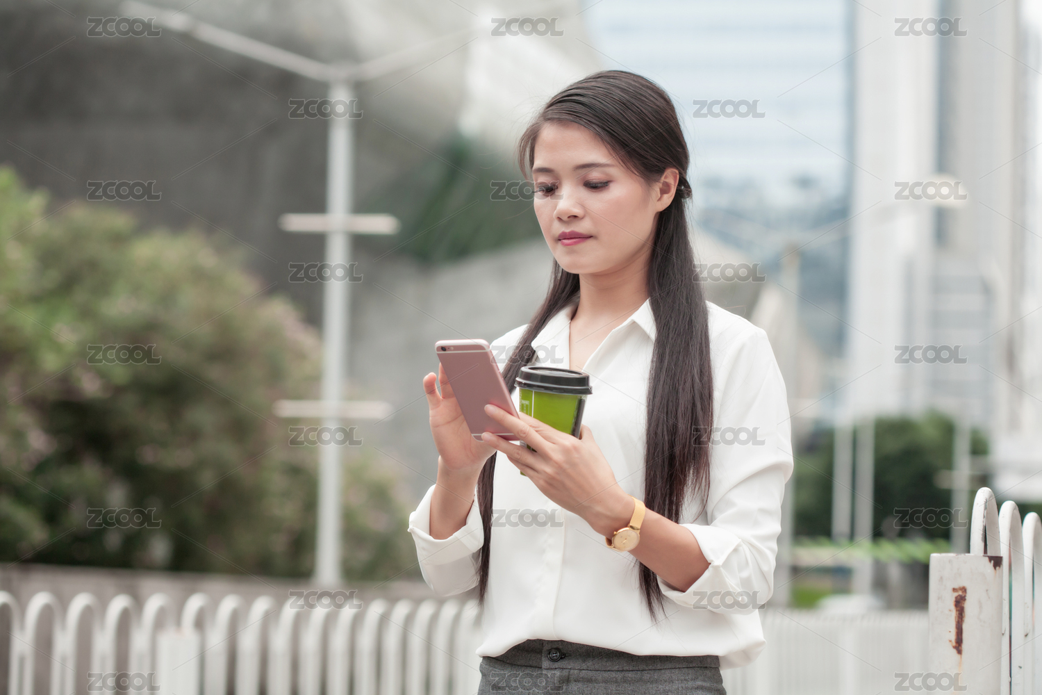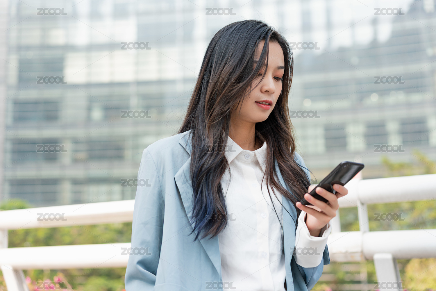 迷人的成功商务办公的女人拿着移动智能手机和看远视力站在办公室外。