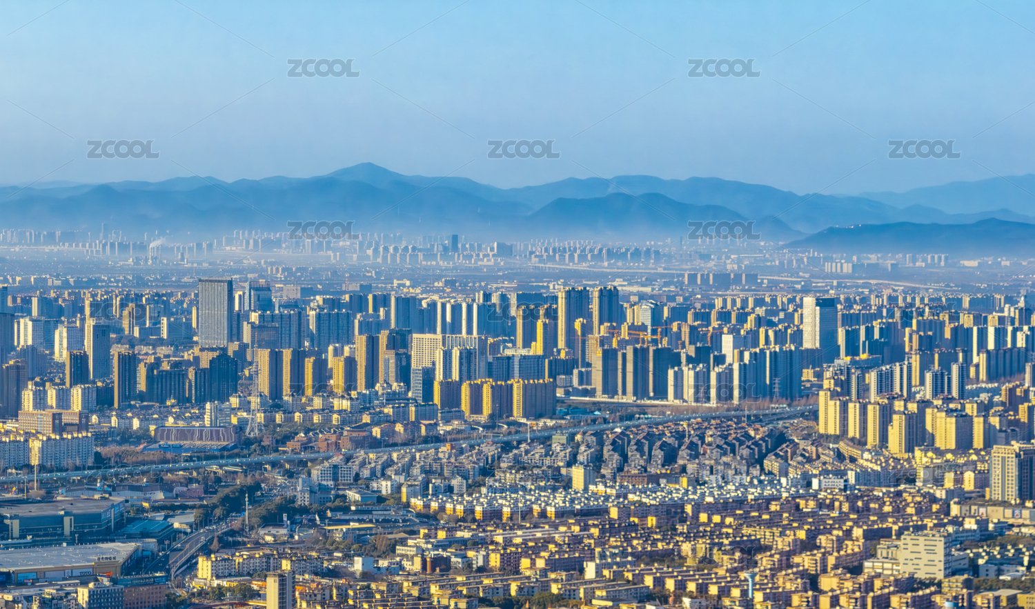 夕阳暖色下的余姚城区