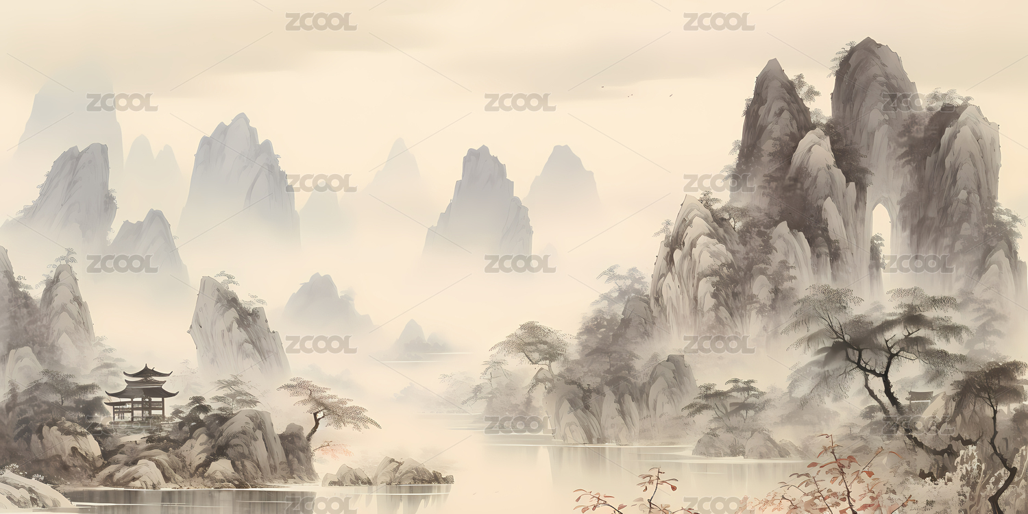 中国传统浅蓝色山水古风国风水墨画背景壁纸