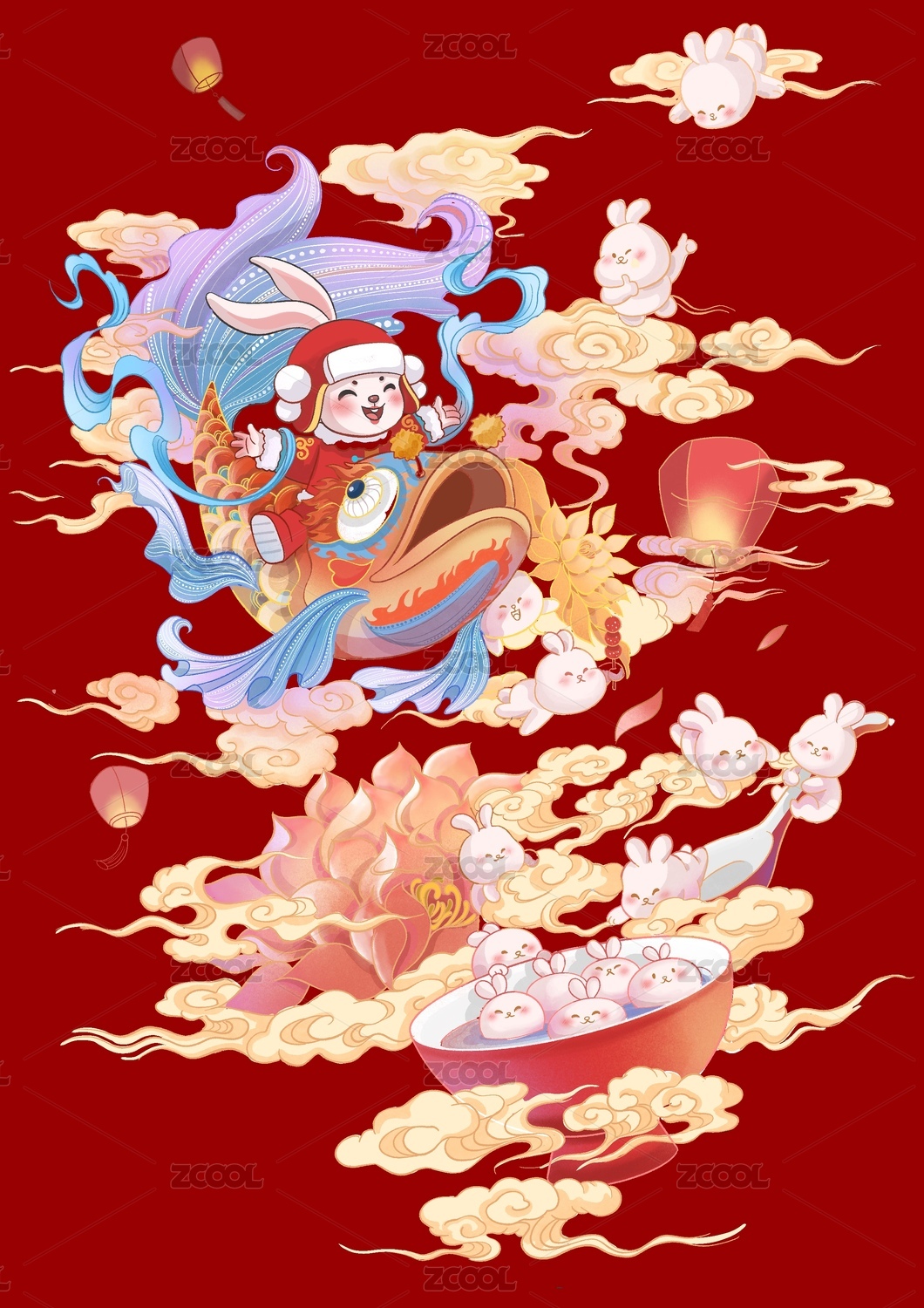 传统春节新春兔年节日插画兔子来送福