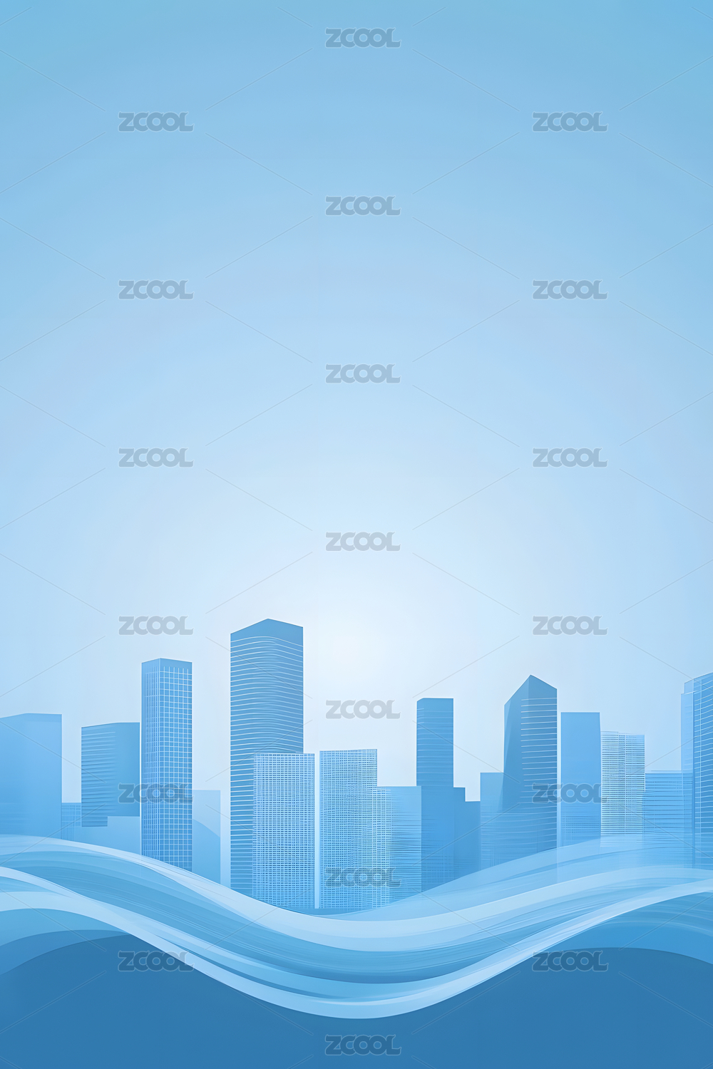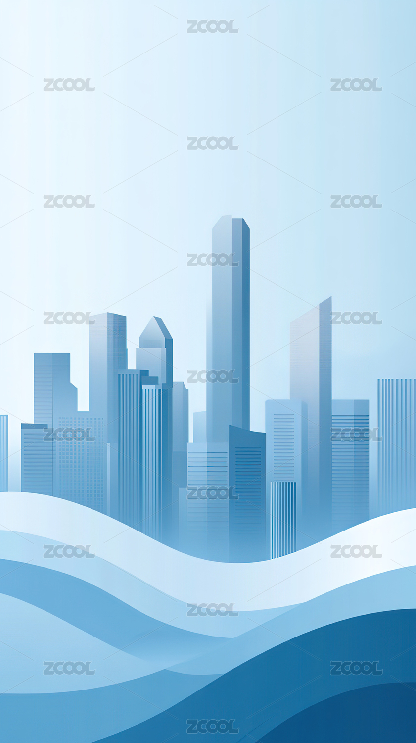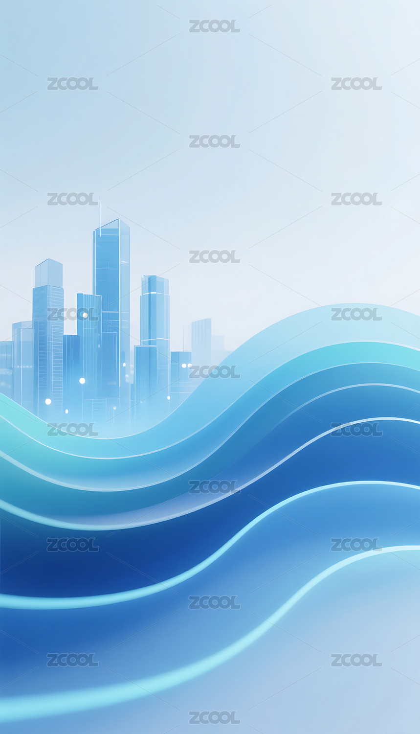 流畅的蓝色渐变波浪线条玻璃城市建筑