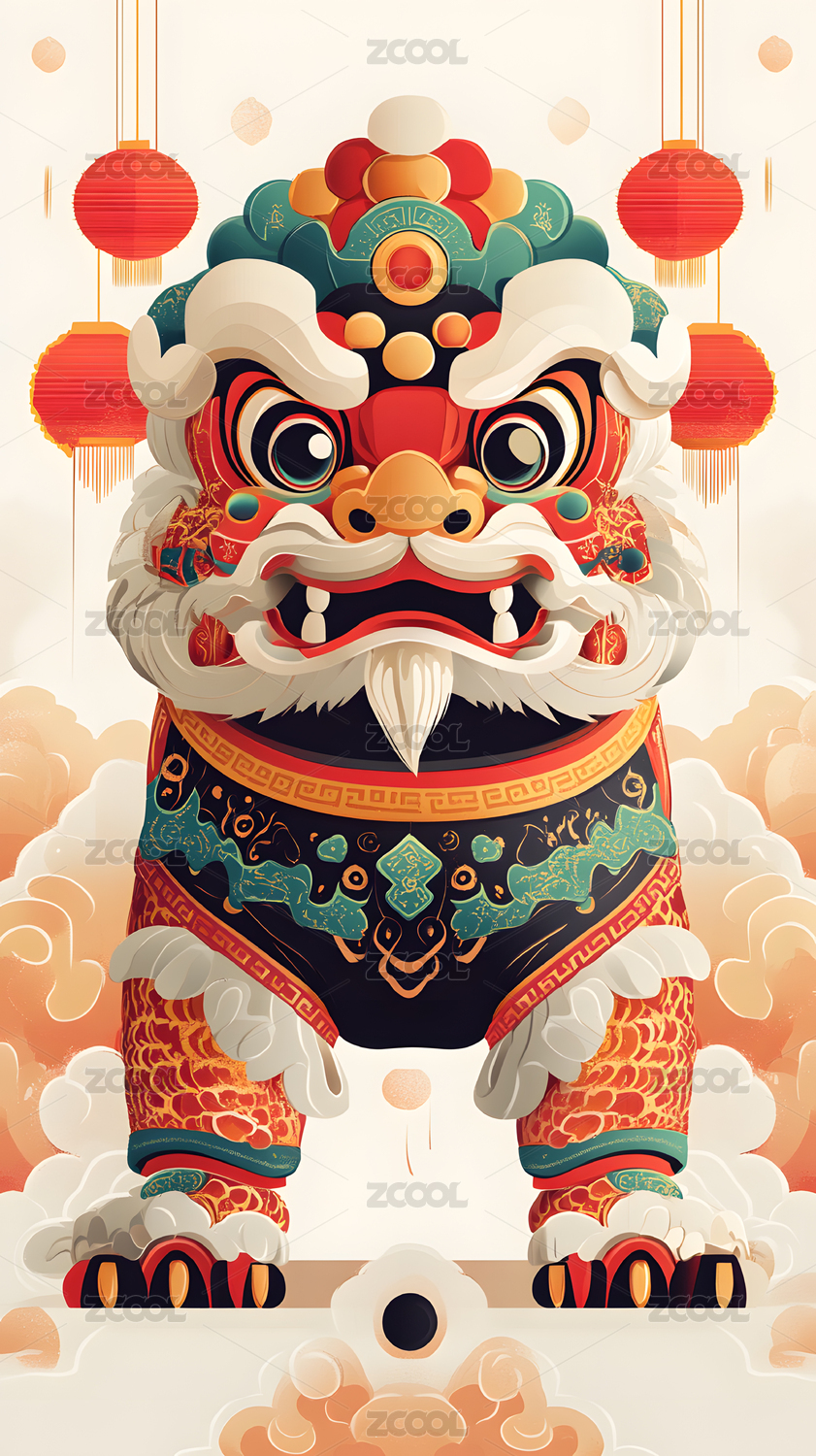 红色喜庆新年祝福传统醒狮插画,春节舞狮贺