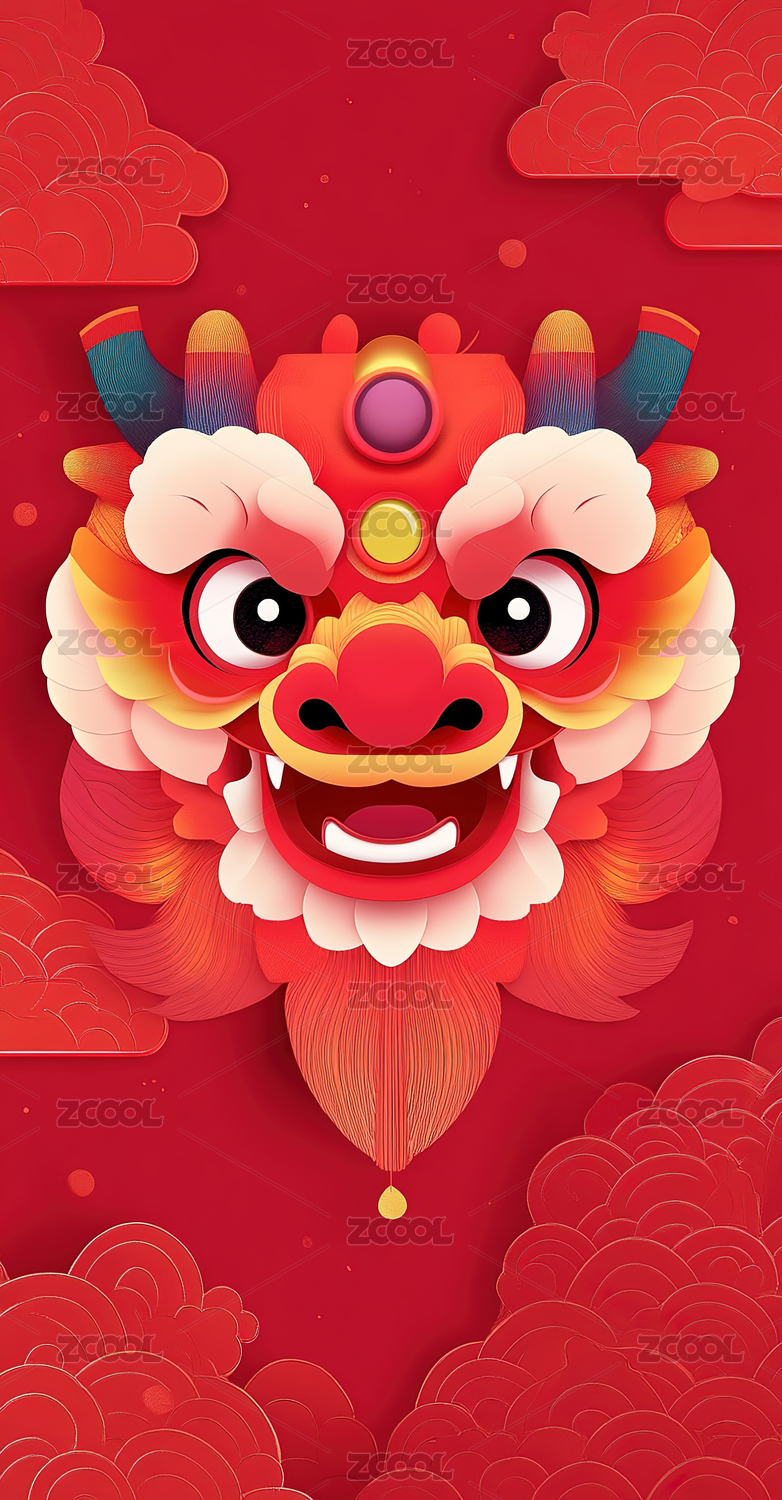 3d立体风格中国年国潮醒狮龙头壁纸插画