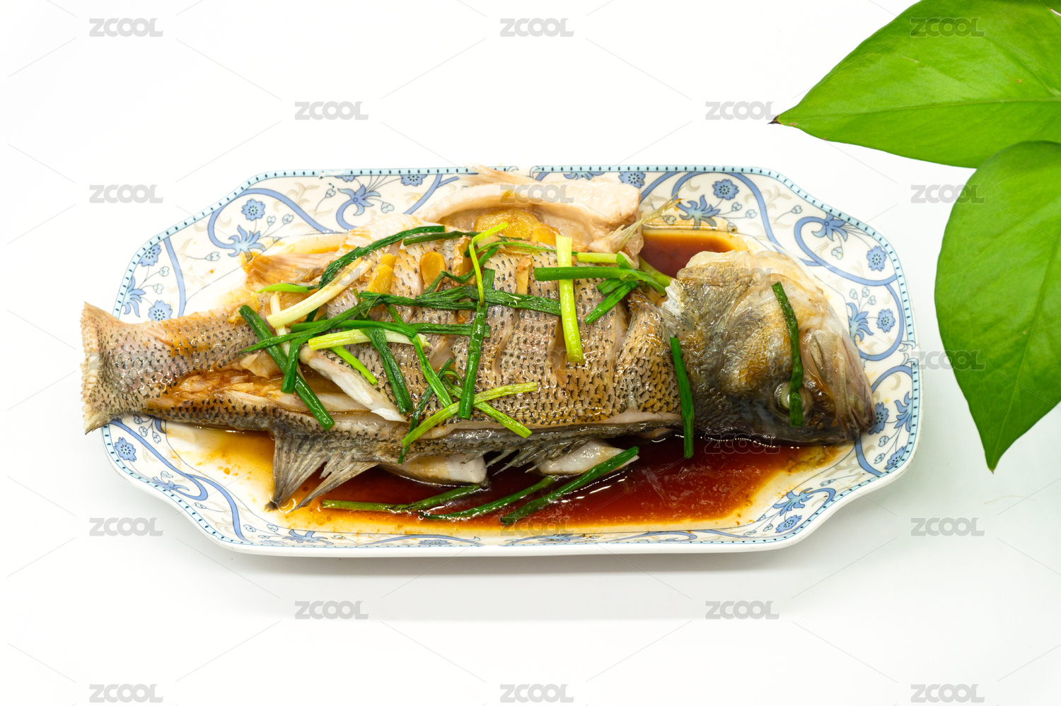 白色背景传统粤菜清蒸鲈鱼