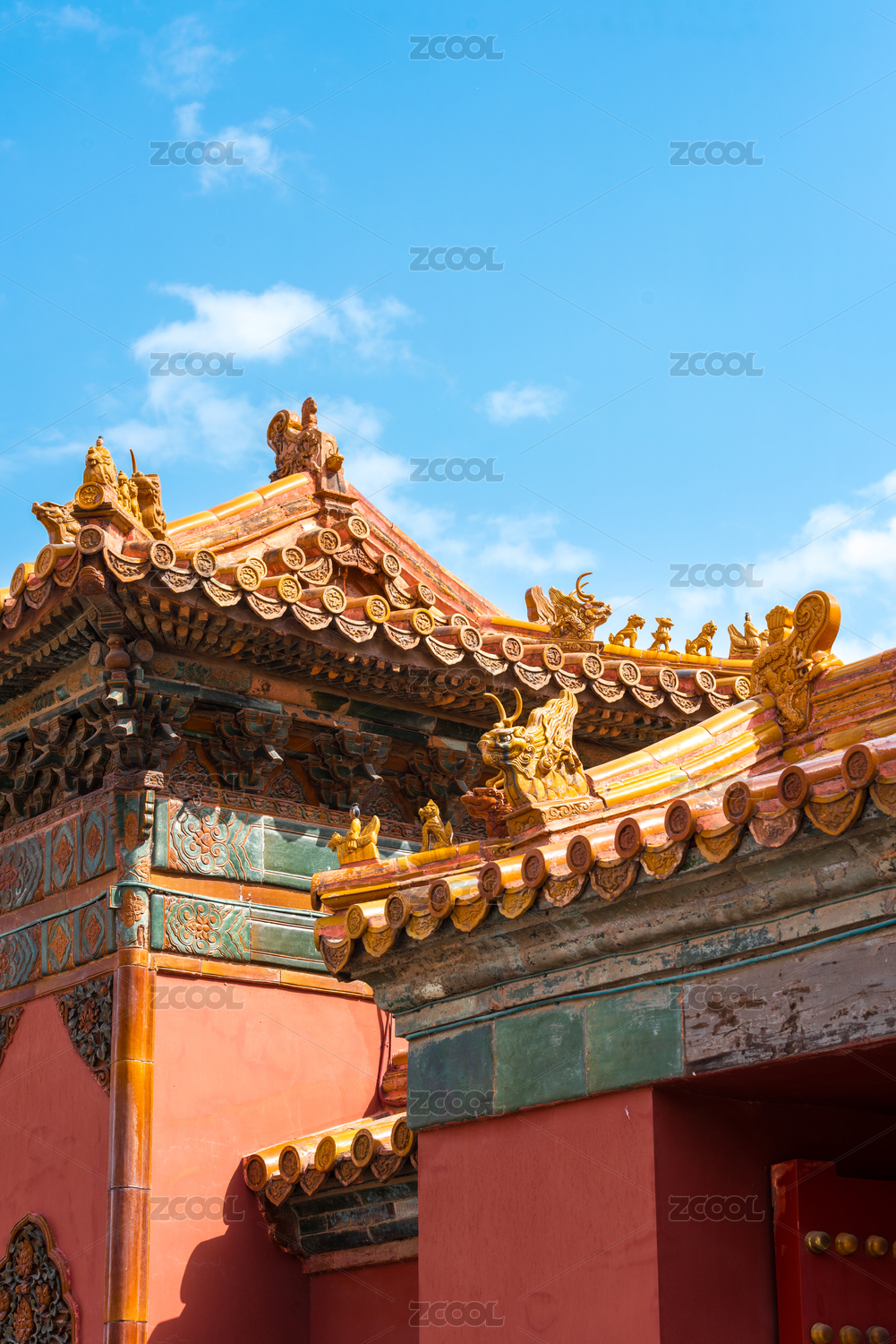 北京故宫宫殿古建筑红墙黄色屋檐局部特写