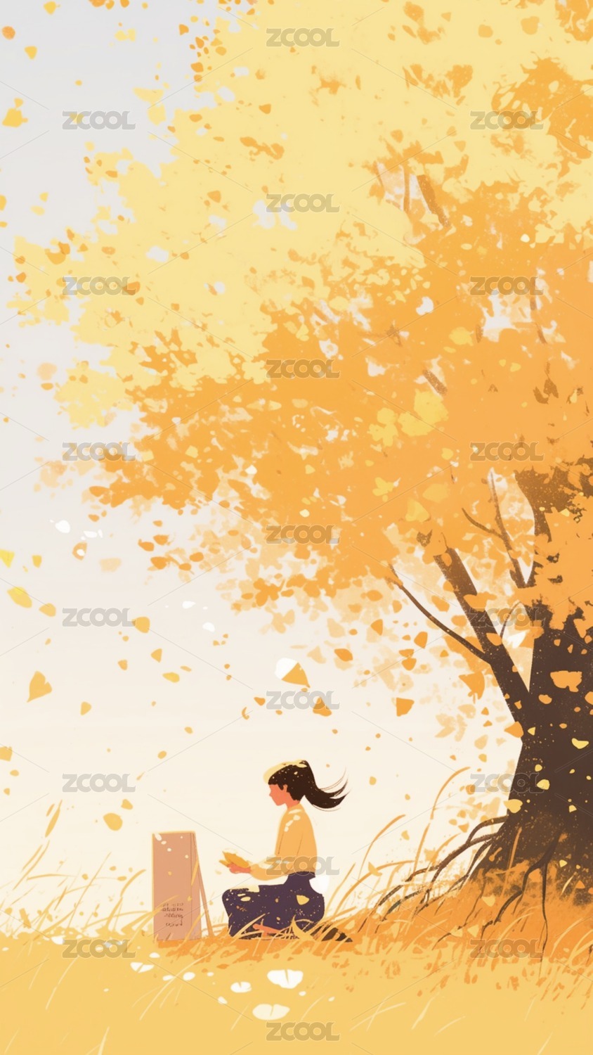 秋季少女与银杏叶插画
