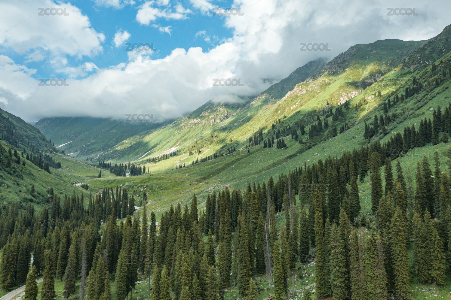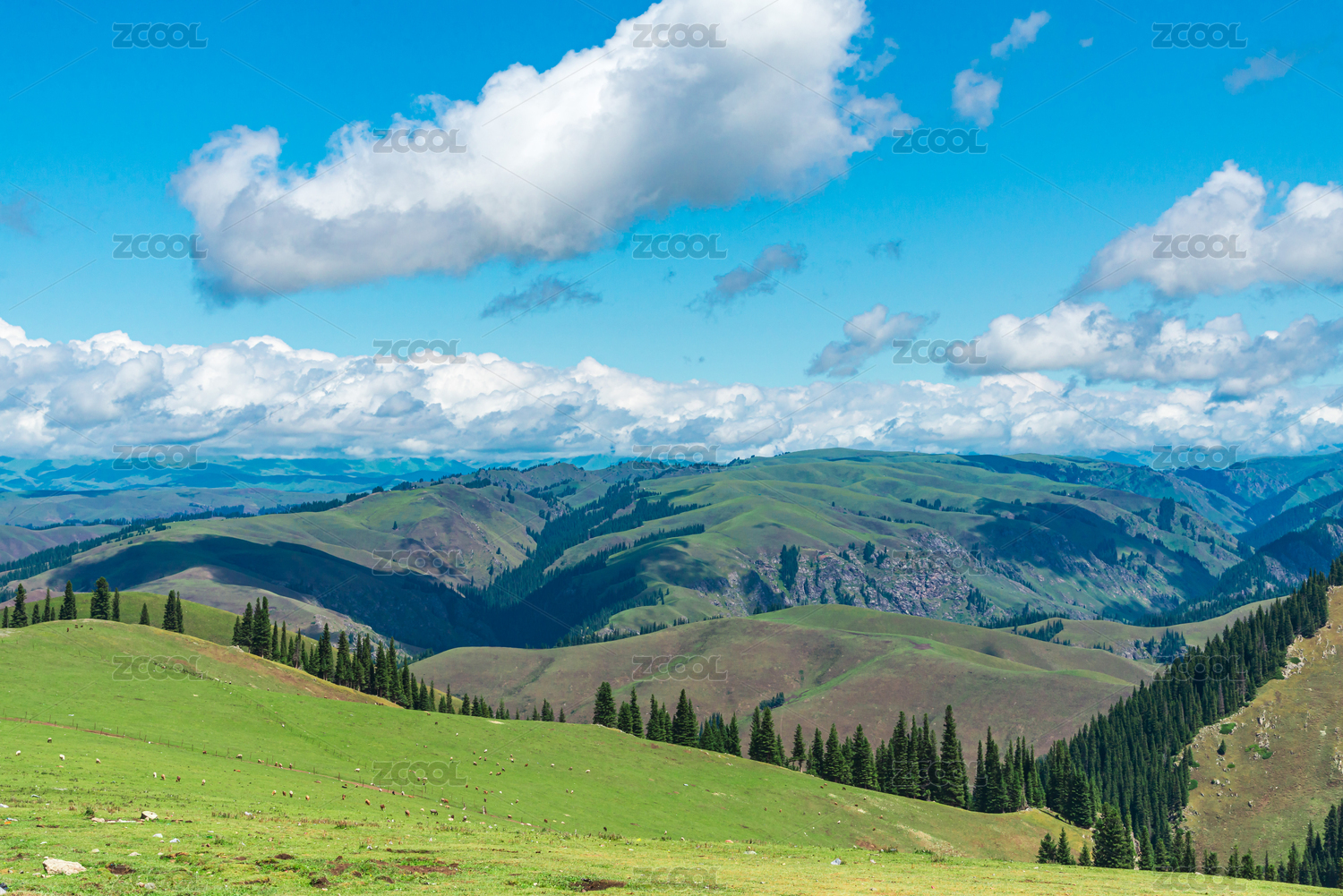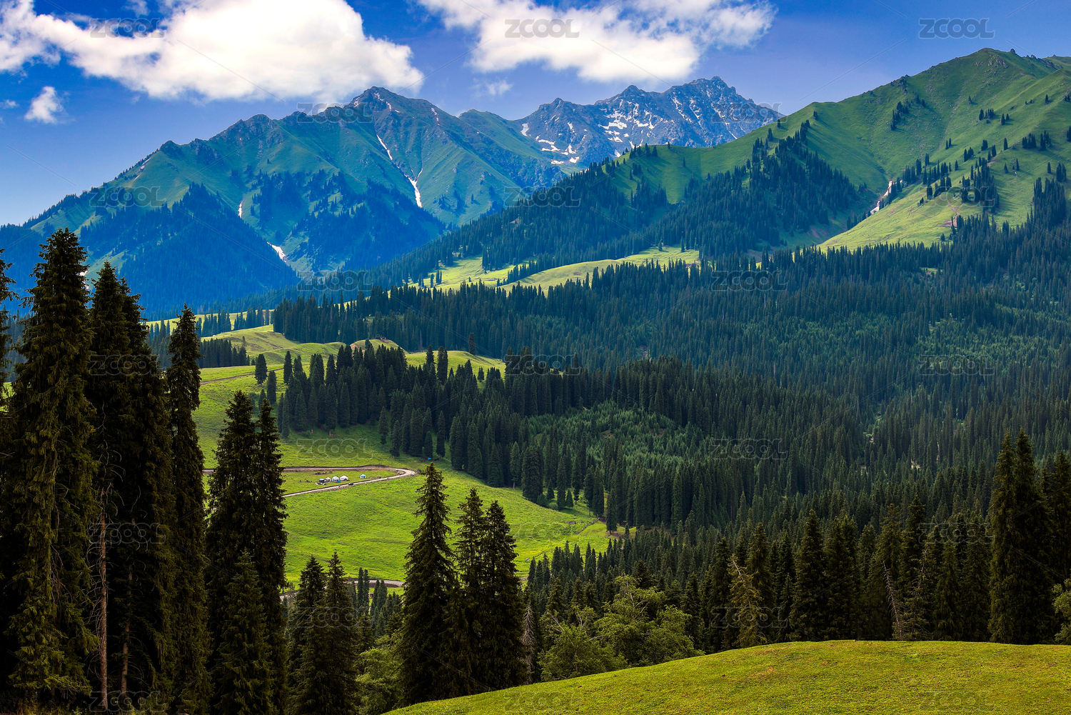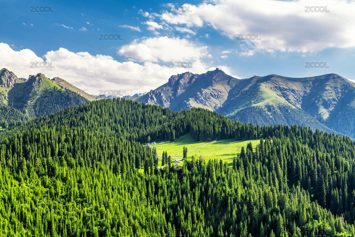 新疆下塔风景区雄伟的山脉和绿色的草原风光