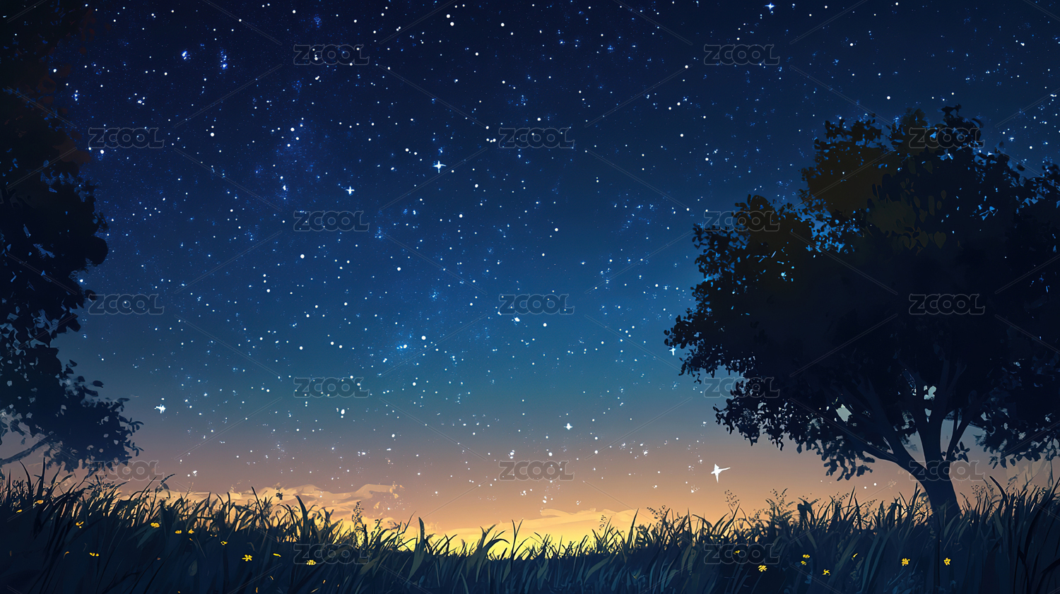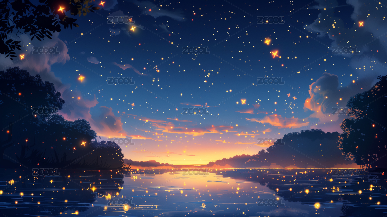 森林夜晚星空河流萤火虫神秘宁静唯美插画