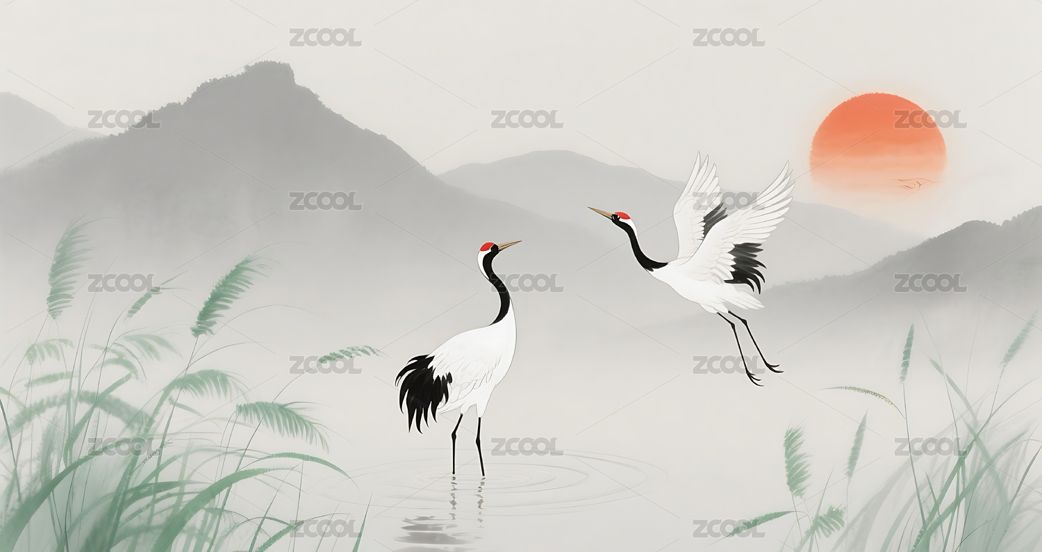 宁静,景色,意境,自然,风景,和谐,夕阳,丹顶鹤,落日,余晖