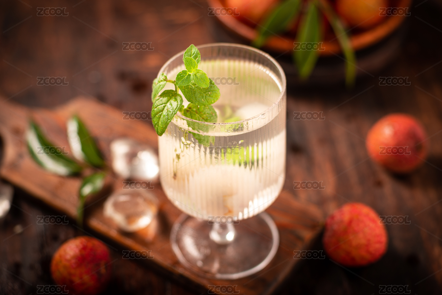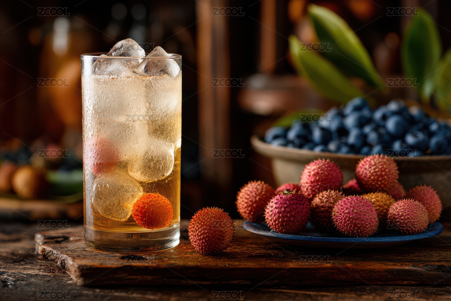 木纹背景下桌子上放着水杯和新鲜荔枝水花