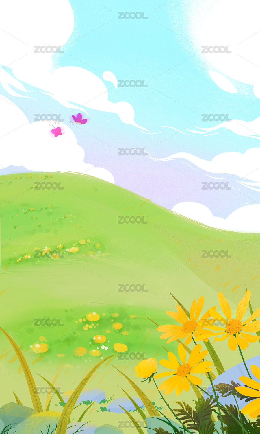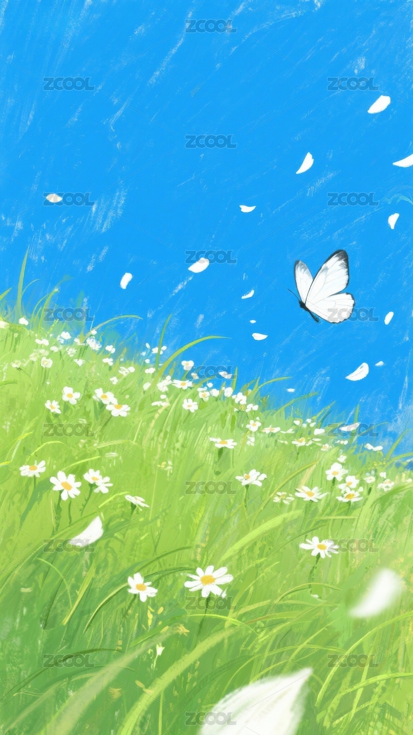 夏季阳光明媚的自然风光蓝天白云花和蝴蝶