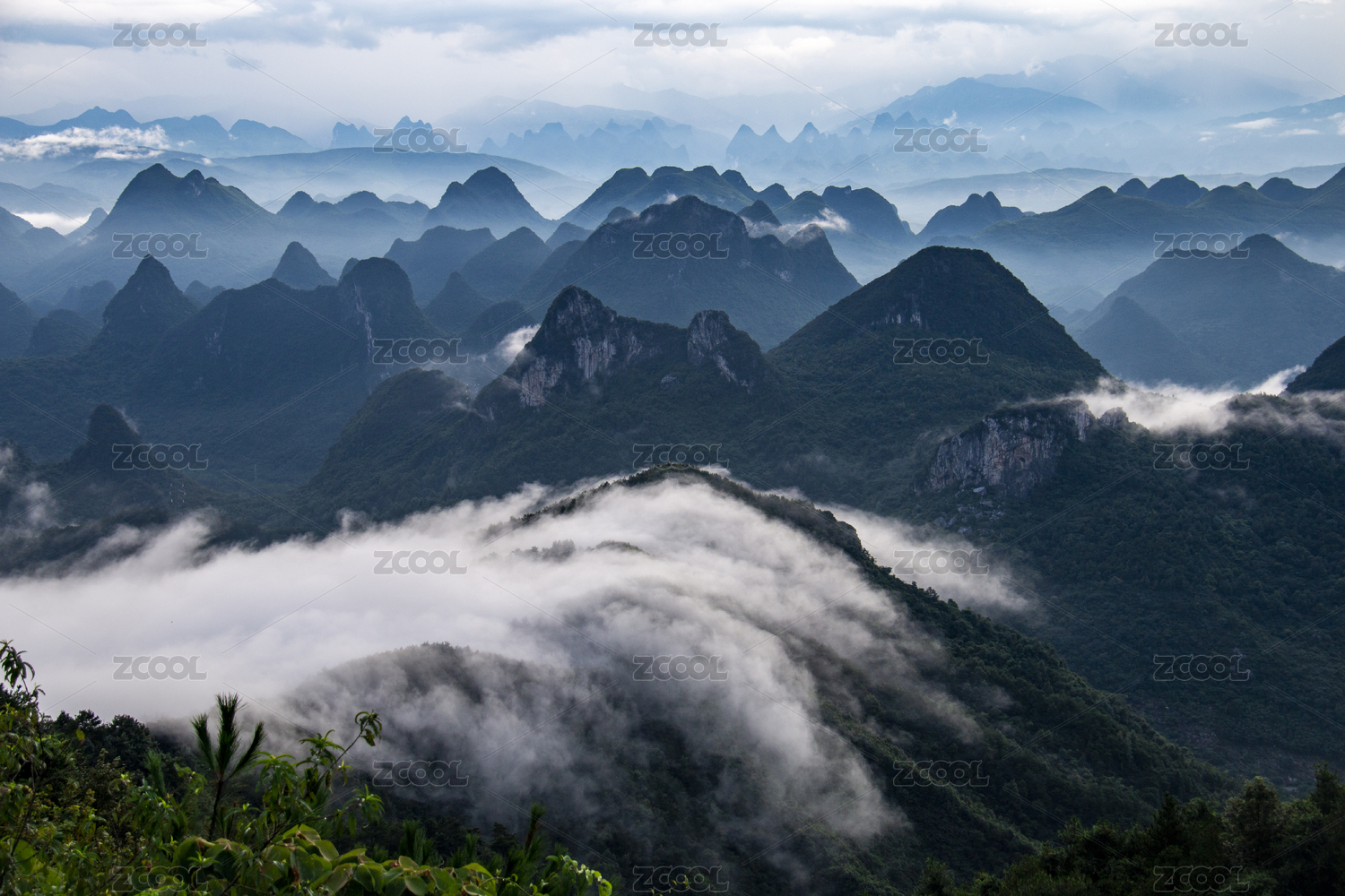 航拍广西夏季晨雾中的绿色黄色的红岩口村