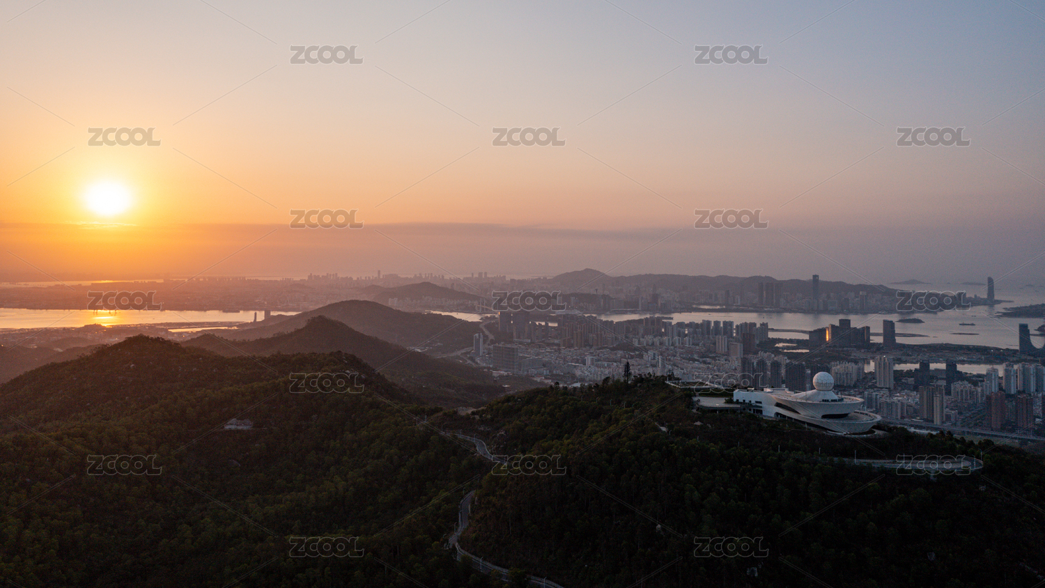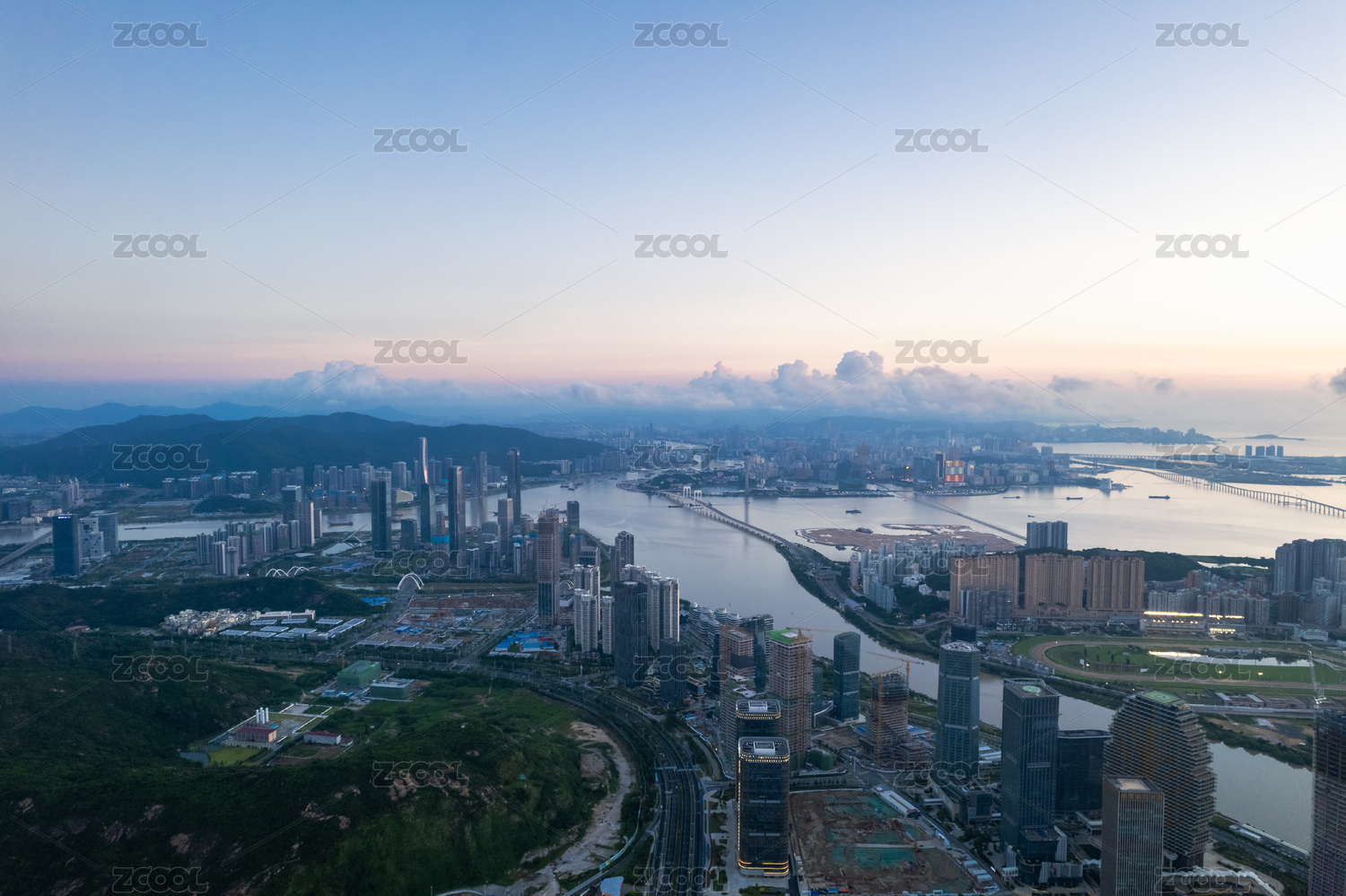 珠海澳门湾仔CBD十字门全景拼接日出晨光