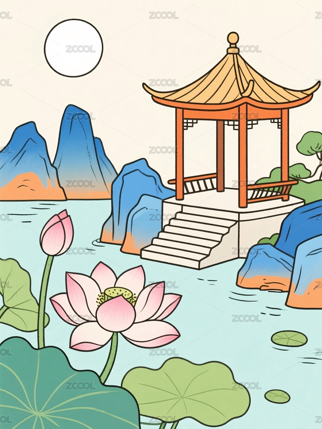 24节气插画夏天夏至池塘荷花荷叶凉亭