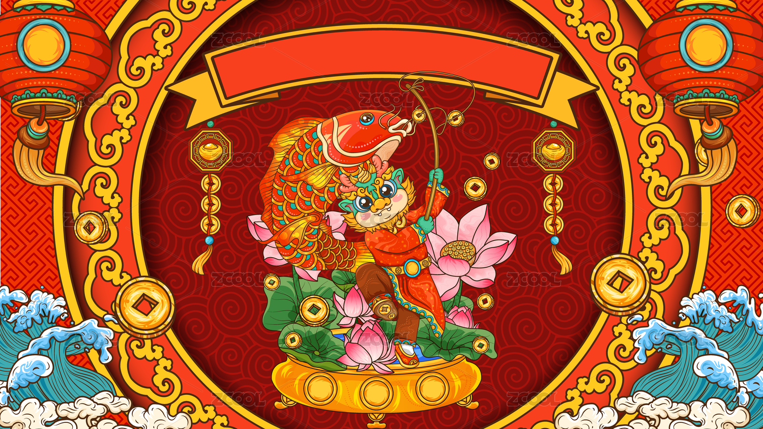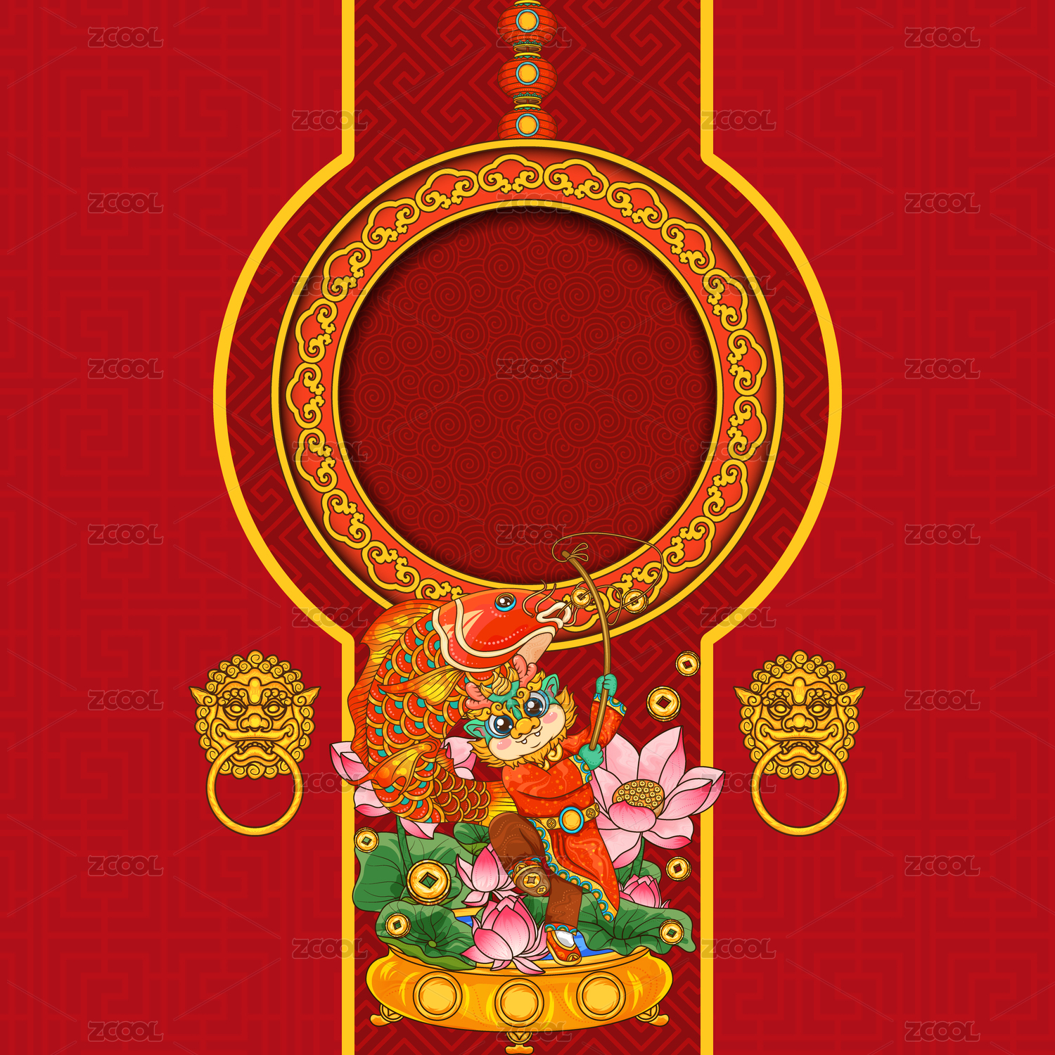 矢量龙年生肖新年春节鲤鱼红包拜年封面背景