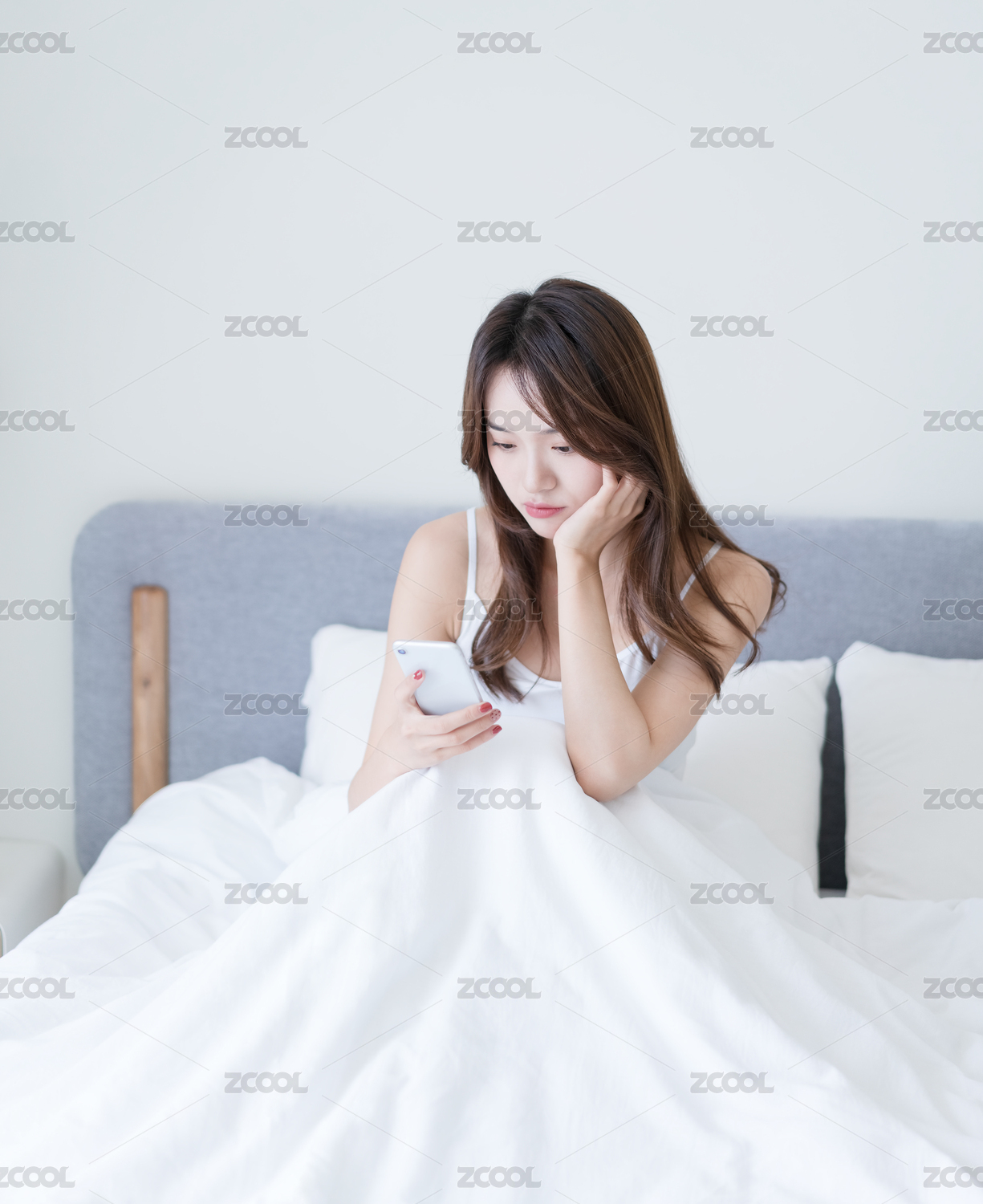 一名年轻的亚洲女子半躺在床上拿着手机自拍