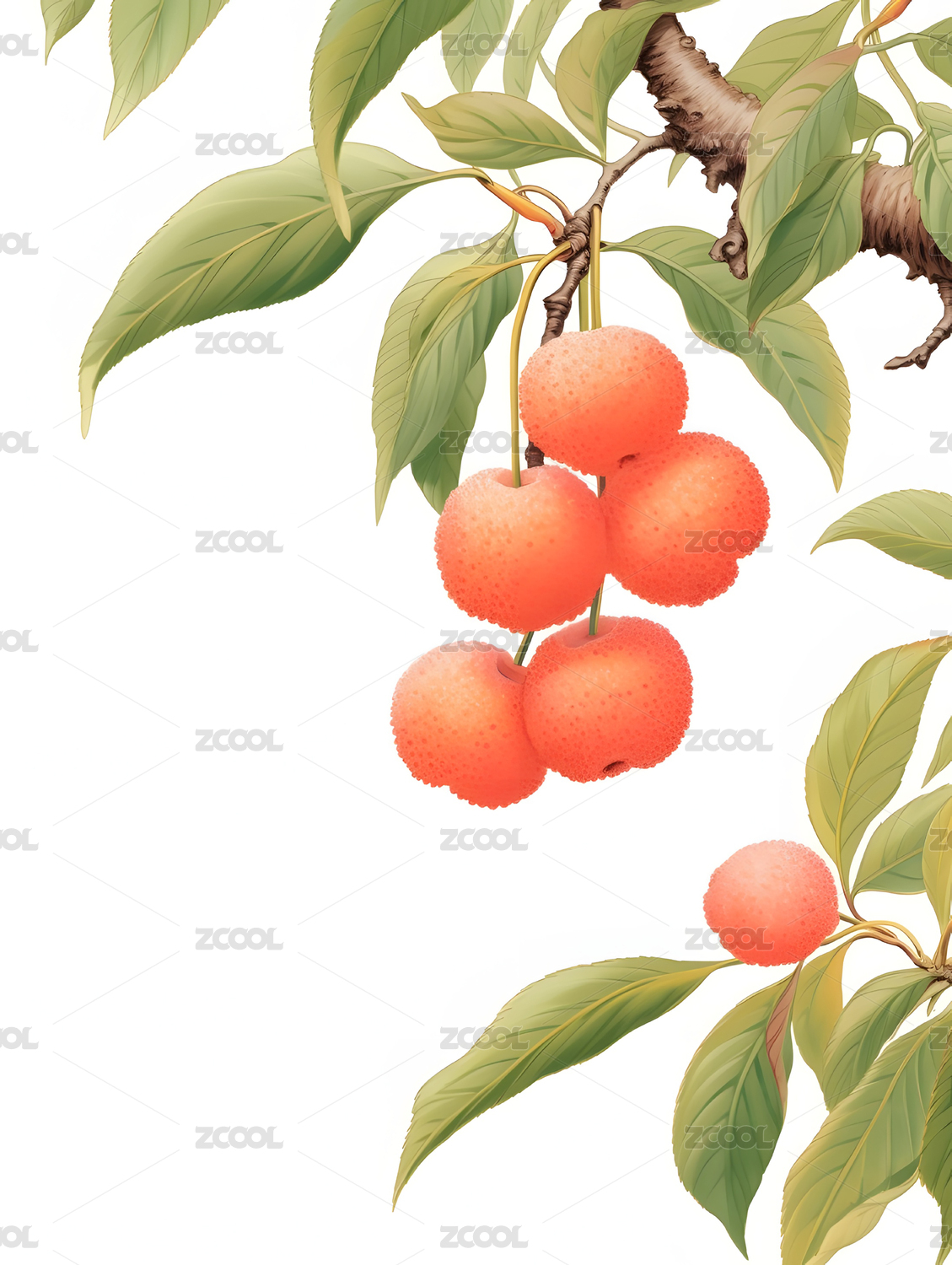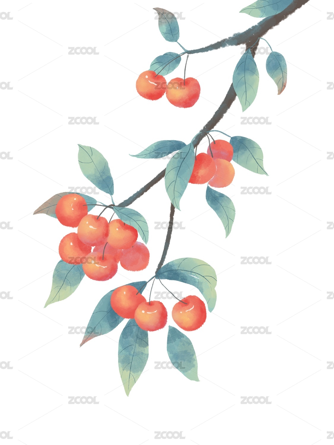 国风手绘树枝上的樱桃