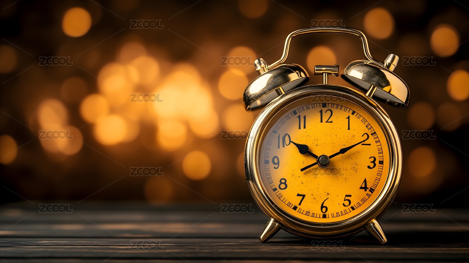金色复古闹钟置于木桌,背景为温暖散景