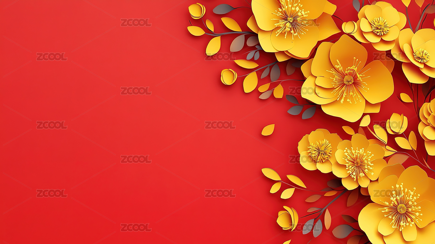 红色背景上的花朵和金色的叶子