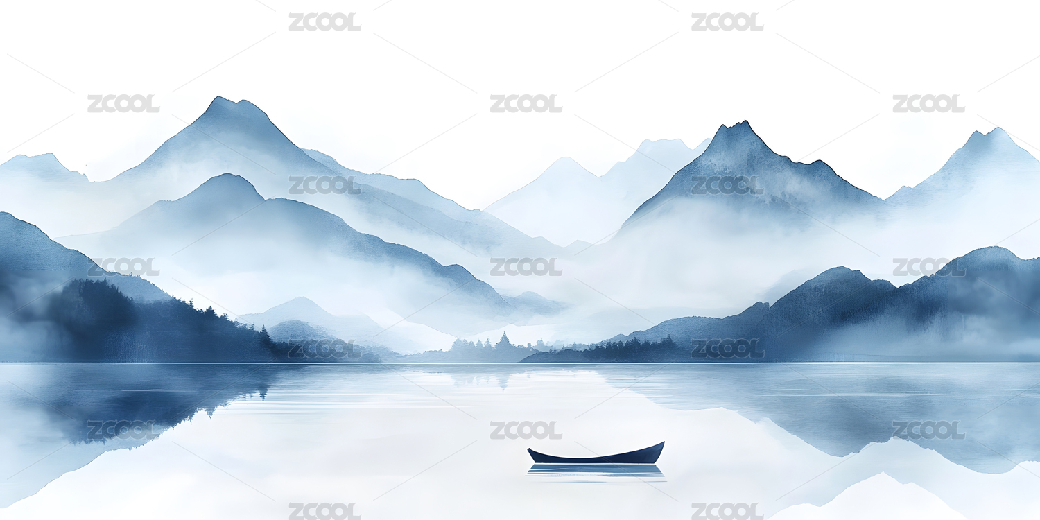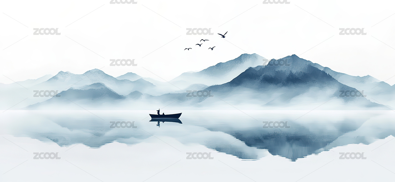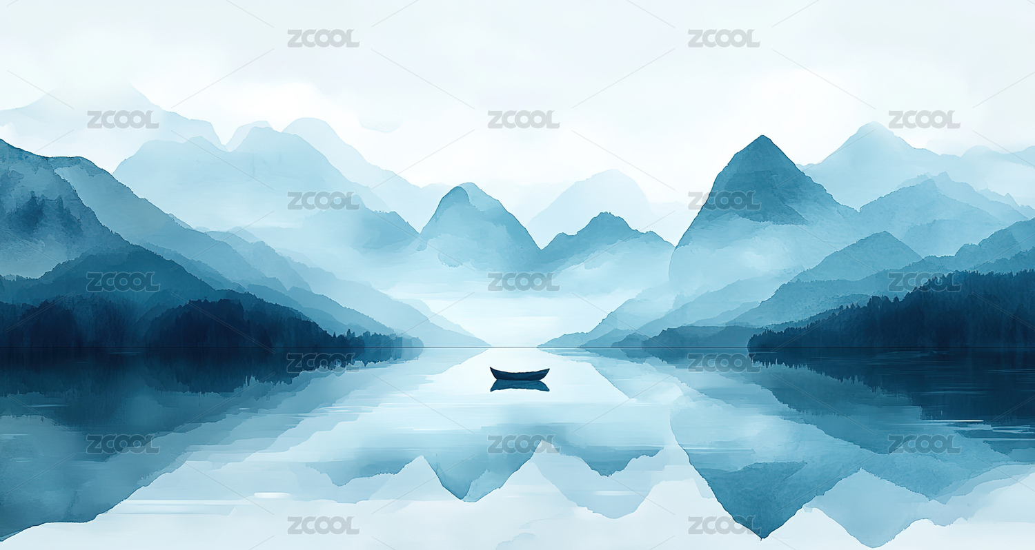 水墨山水小舟静泊湖面倒影