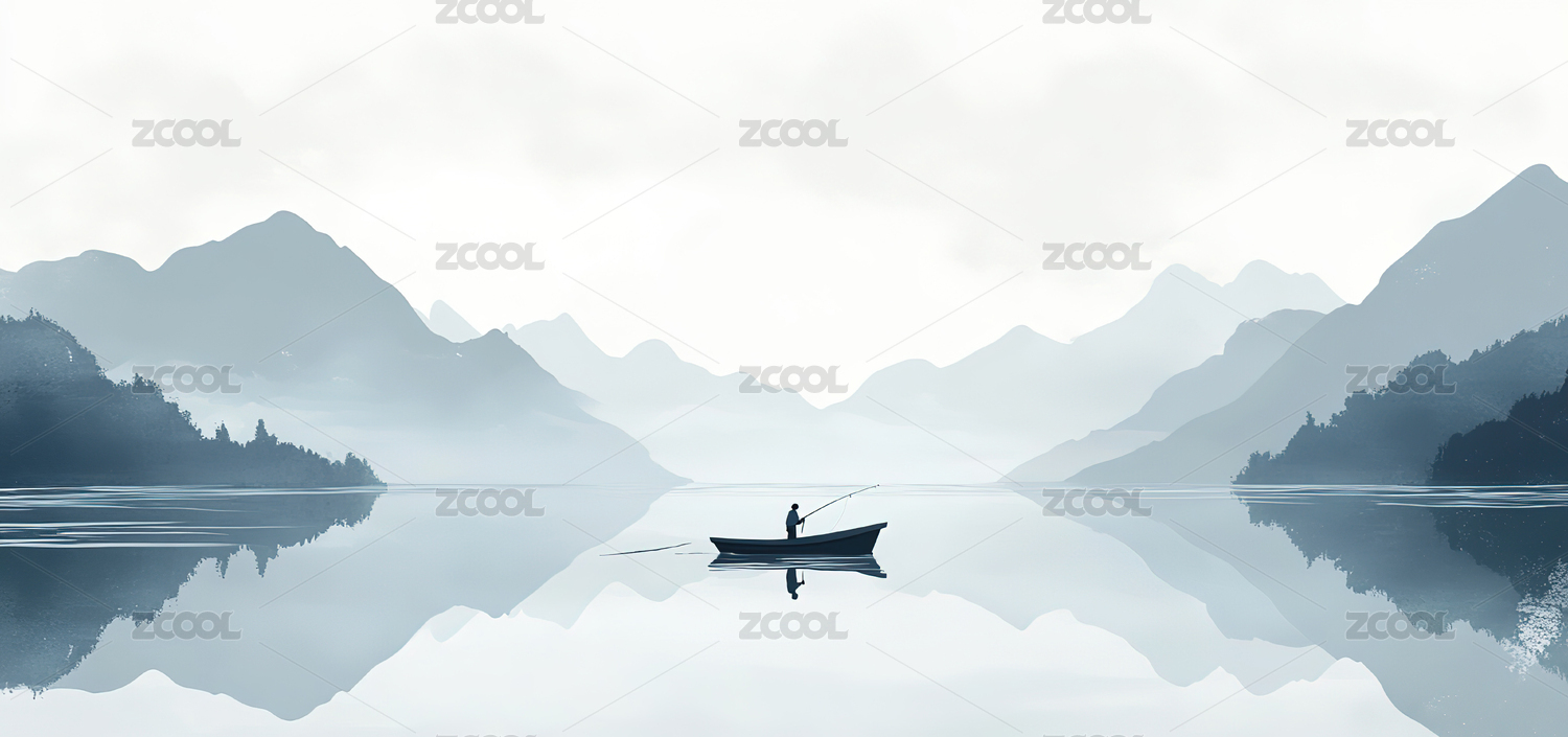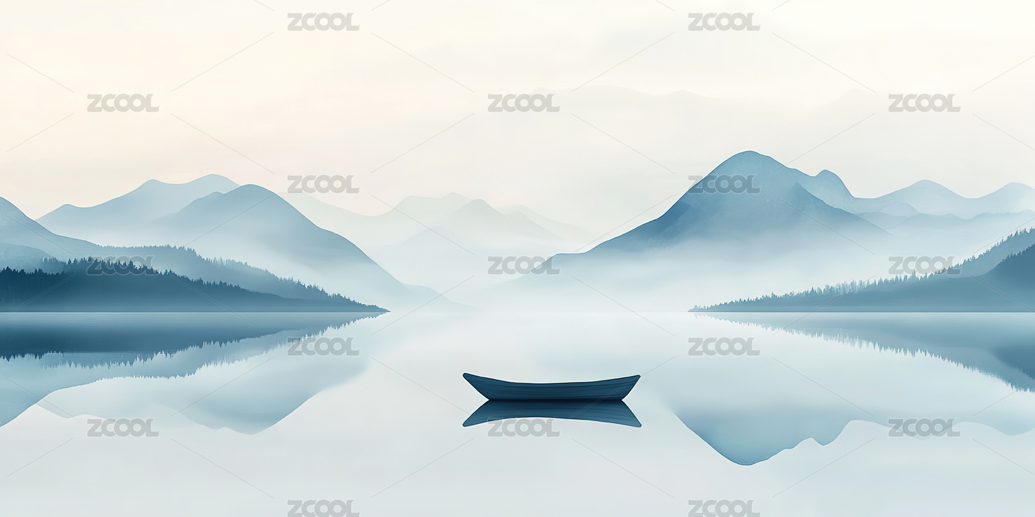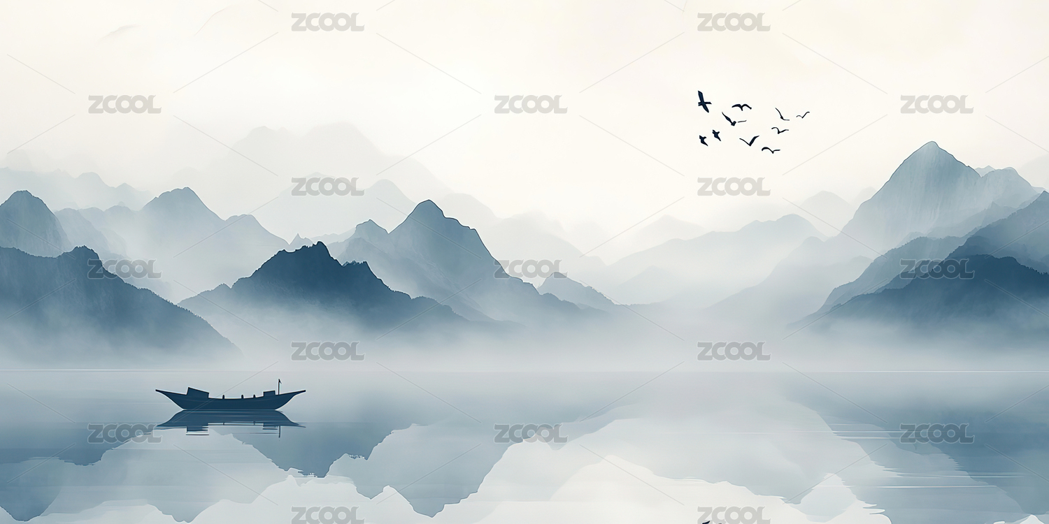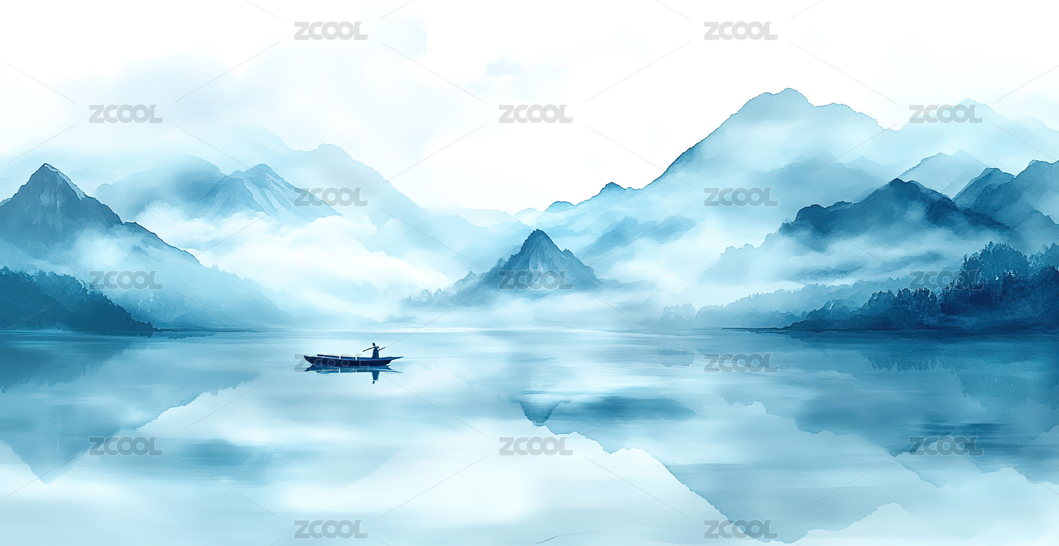 水墨山水小舟静泊湖面倒影