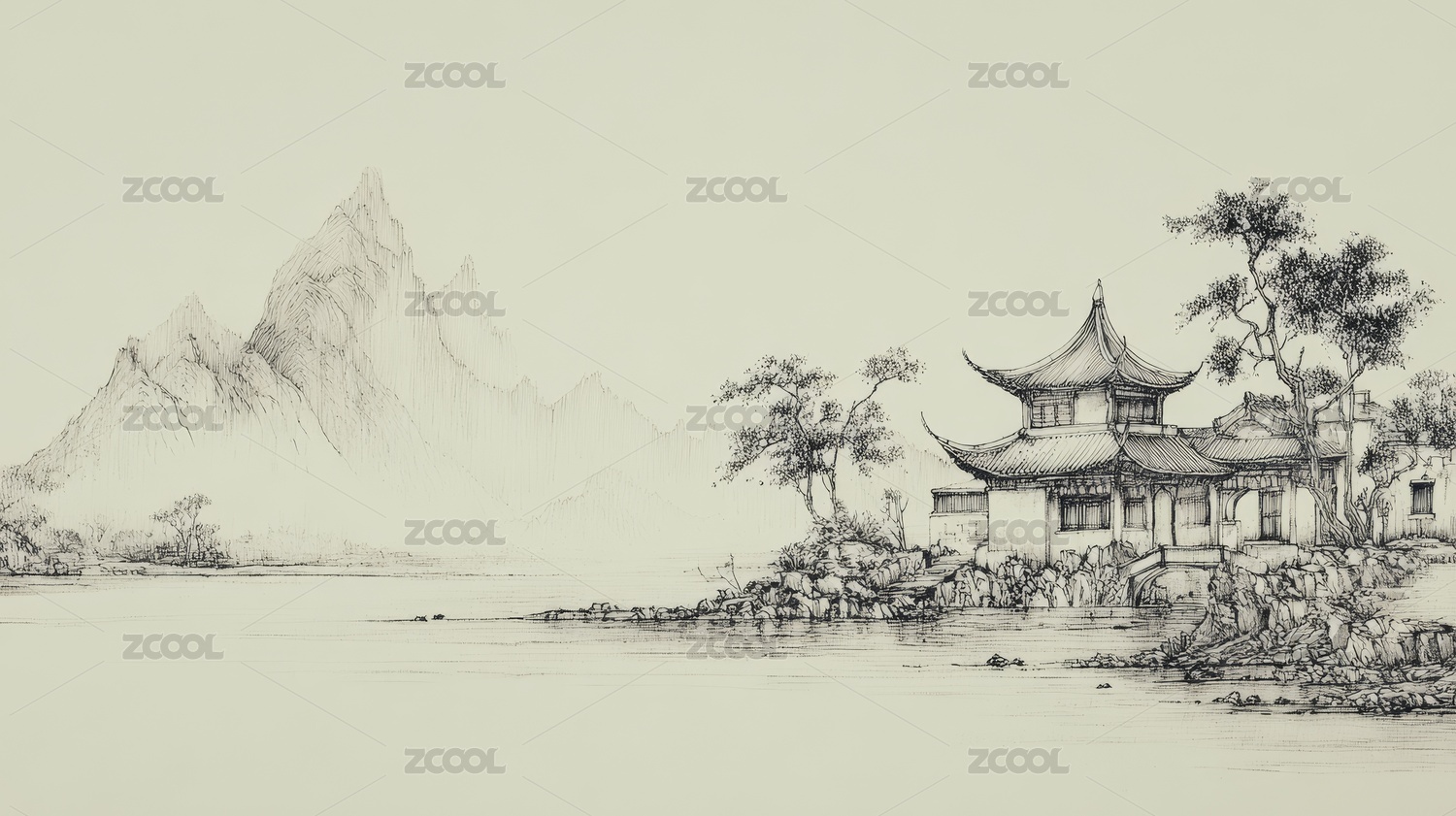 水墨画山水亭台松树石景