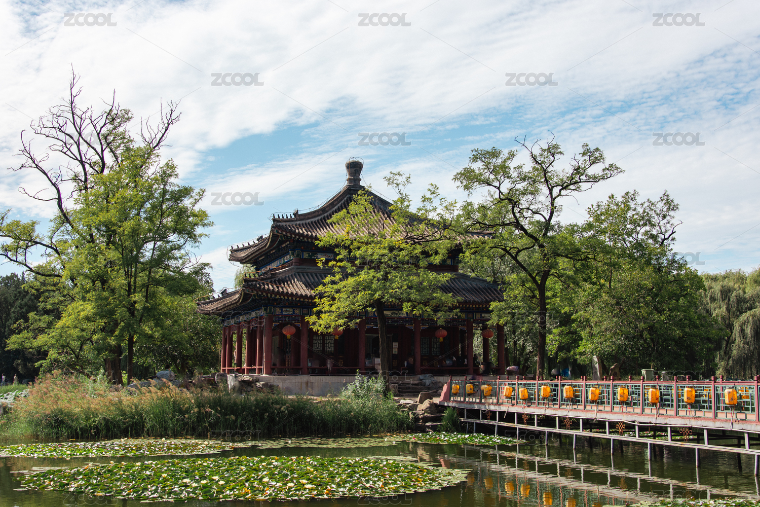 北京市北海公园一角的庙宇和侧光下池塘边上的埆楼
