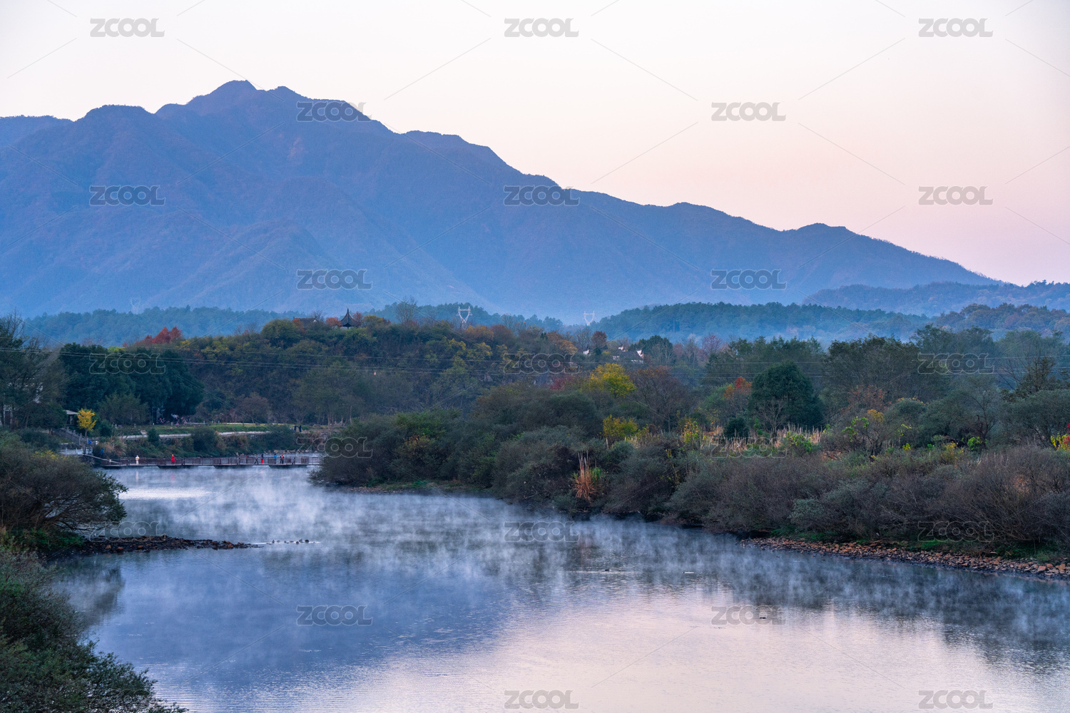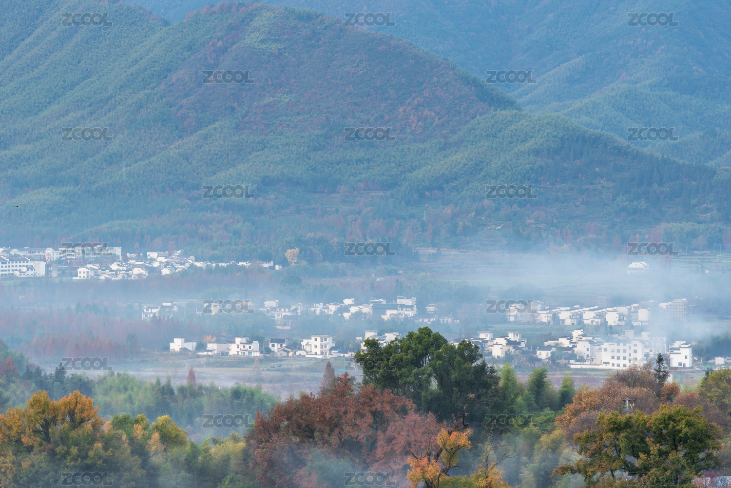 秋季航拍安徽黟县奇墅湖晨雾风景