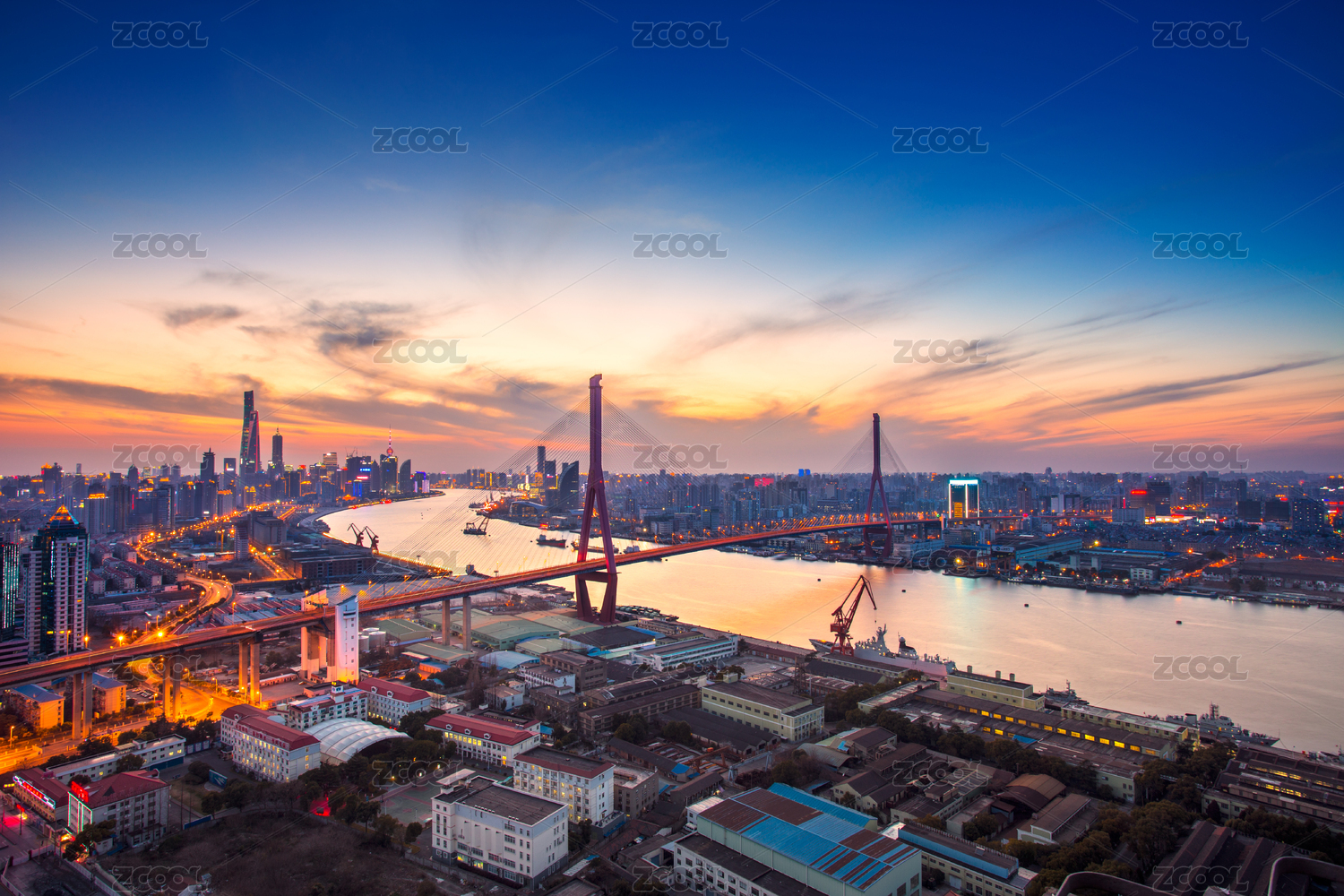中国上海日落下的南浦大桥黄浦江和陆家嘴航拍