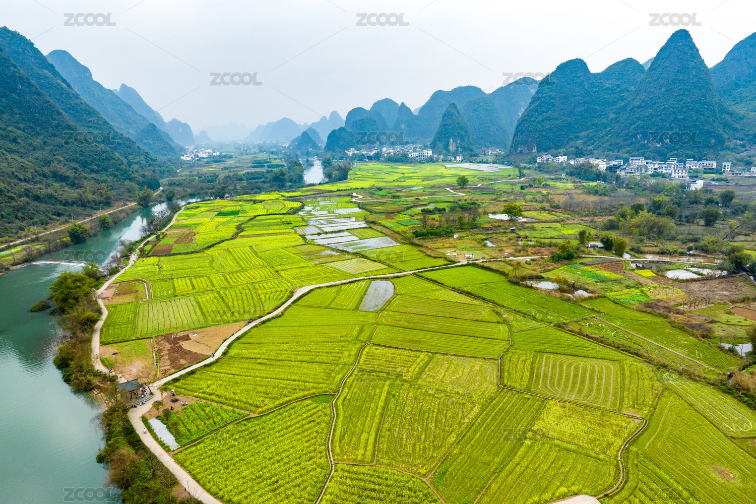 中国广西阳朔遇龙河景区河畔油菜花开景色美