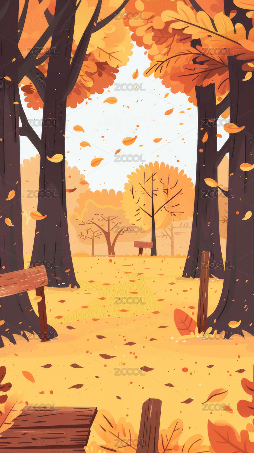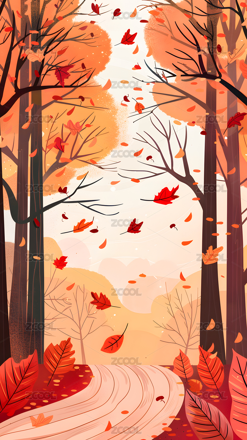 秋天扁平插画蓝天白云树木落叶壁纸竖版